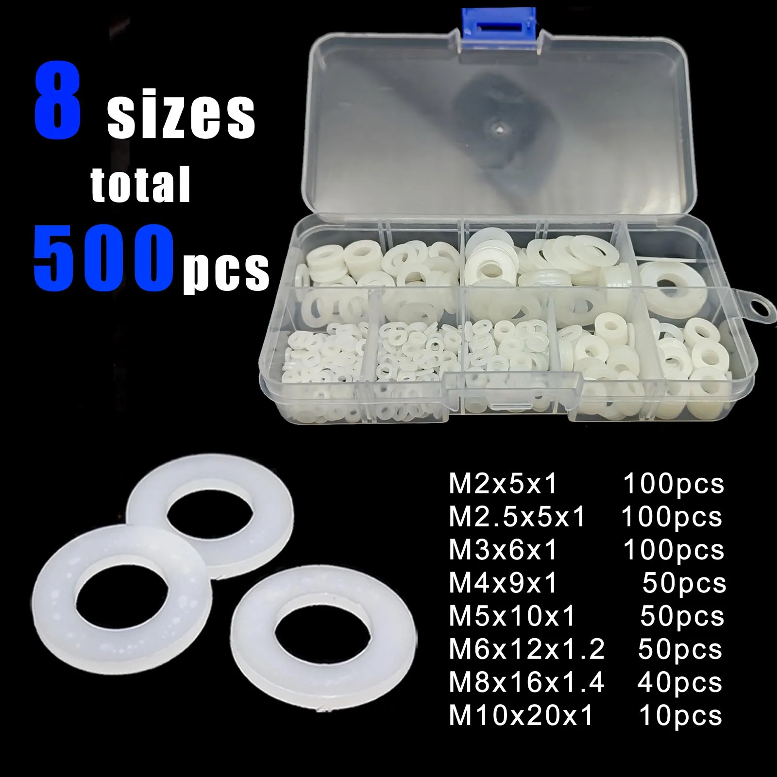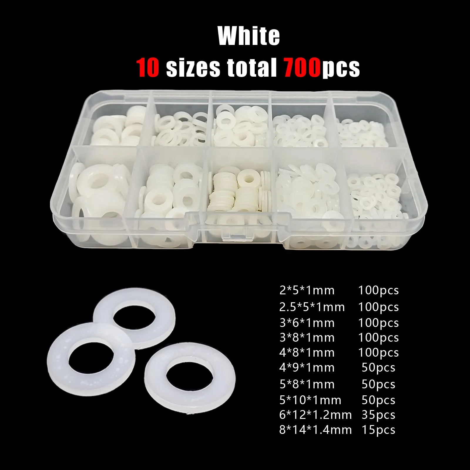 1150/700/500pcs Plastic Nylon Flat Washer Plain Spacer Insulation Gasket Ring Mix M2 M2.5 M3 M4 M5 M6 M8 Assortment Kit Set Box
