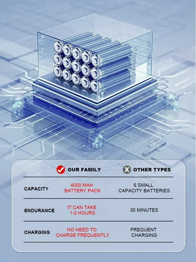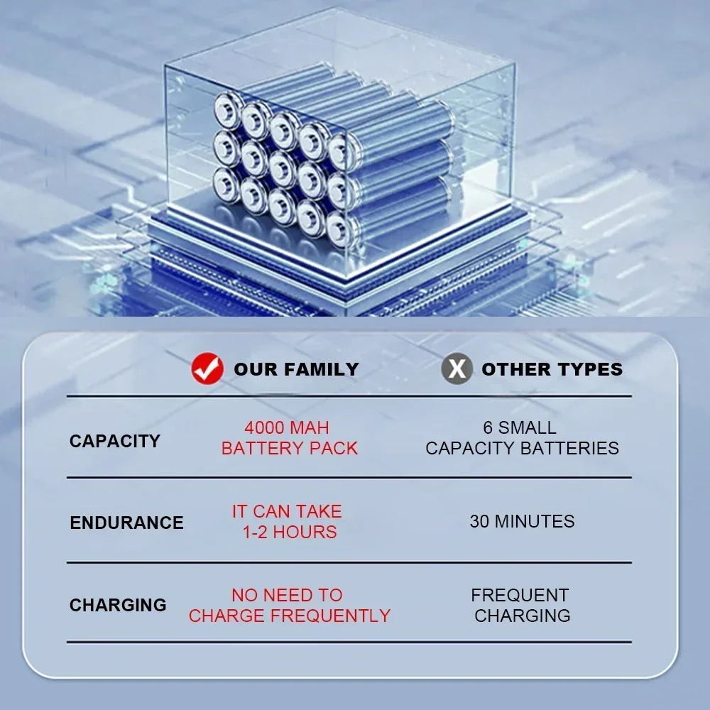 【Long-Lasting Power】The built-in 4000mAh rechargeable battery provides up to 60 minutes of continuous use on a single charge.