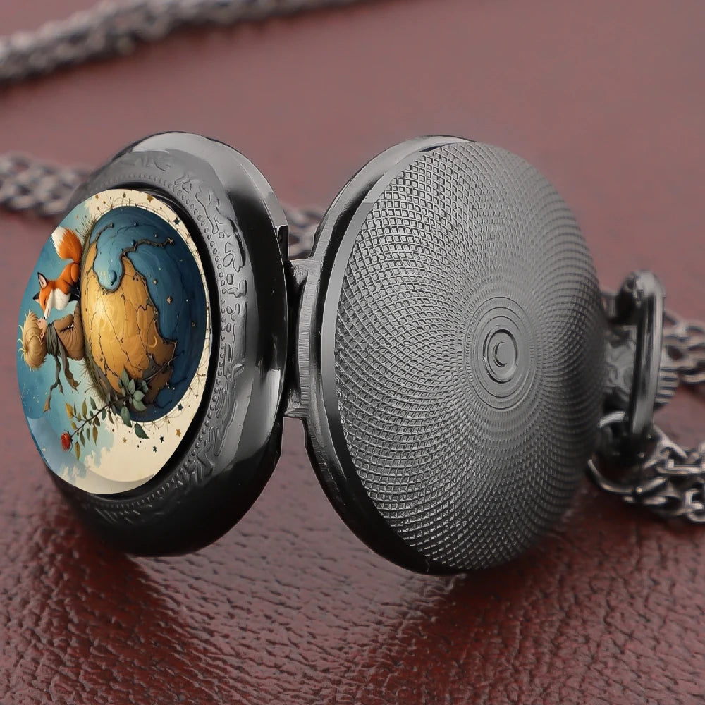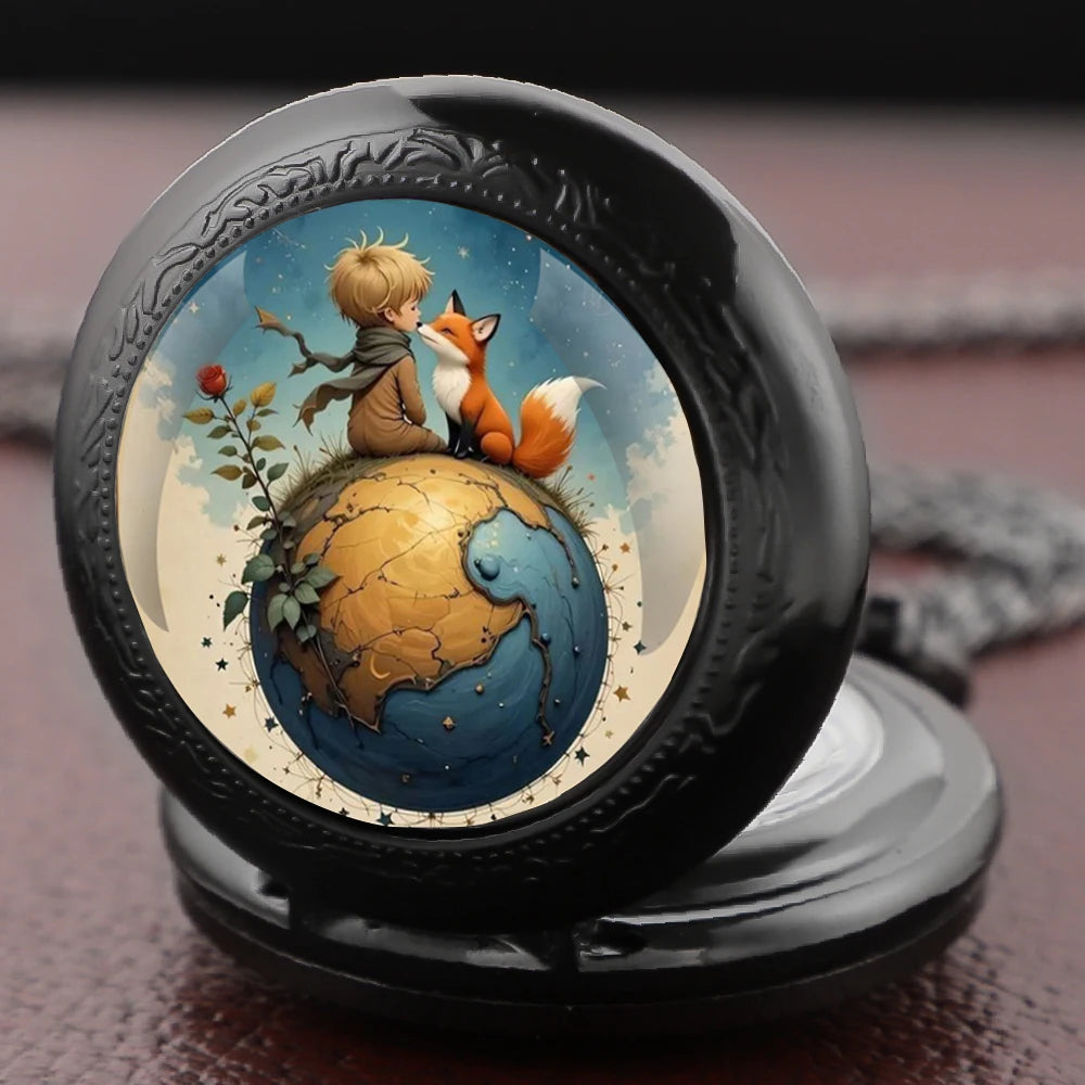 Little Prince and Fox Dome Glass Pocket Watch Arabic Numerals Dial Vintage Men Women Necklace Pendant Watch Kids Chain Gifts