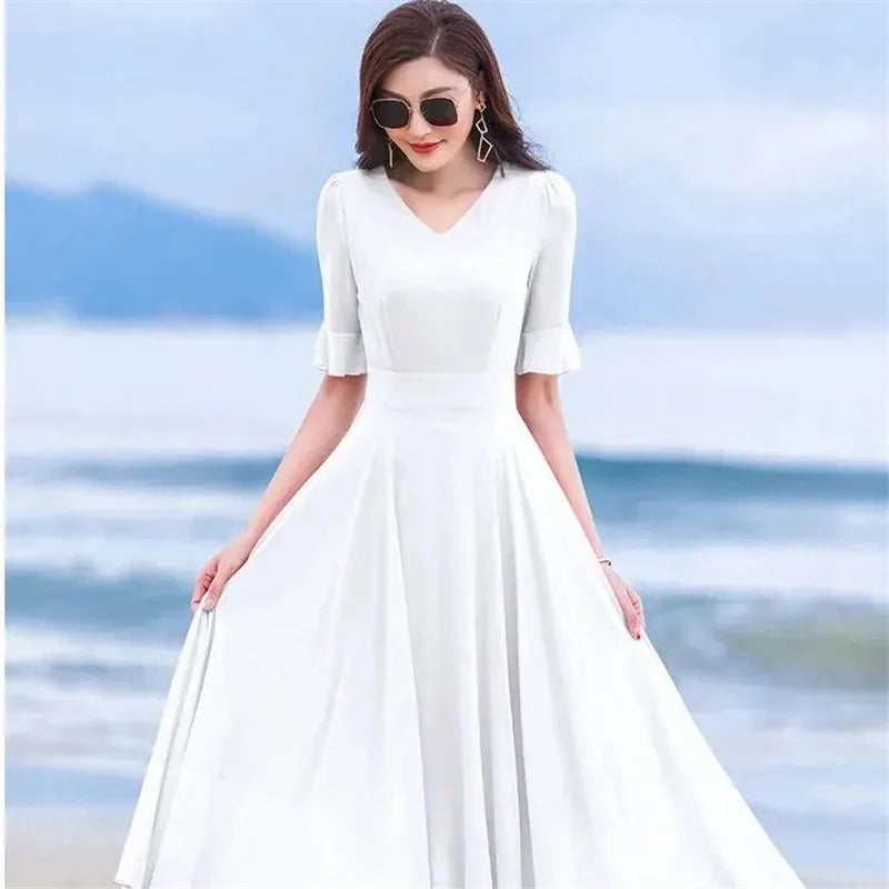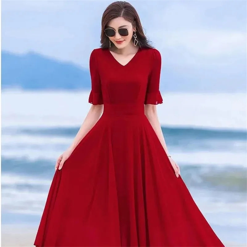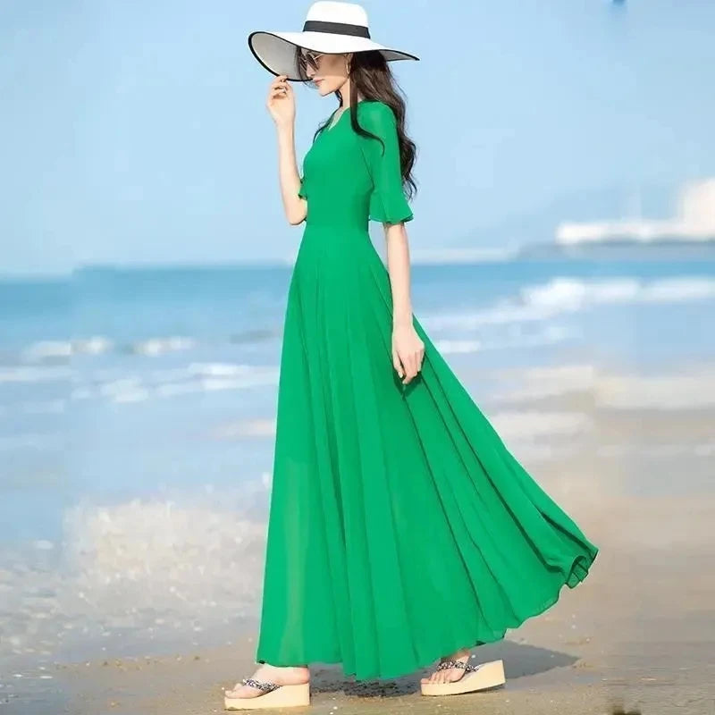 Summer Bohemian Women Long Dress Solid Color Short Sleeve V Neck 5XL Chiffon Sundress Maxi Evening Ladies Party Dress Vestidos