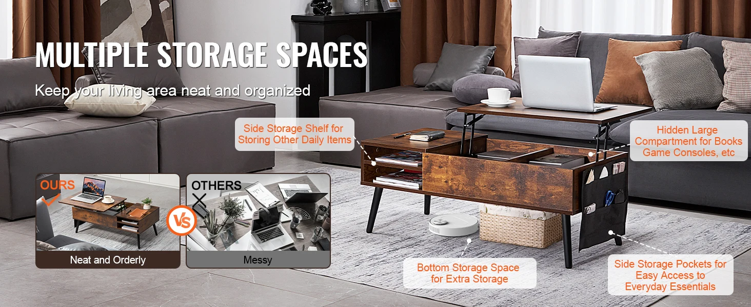 • Ample Storage Space:Under the SucceBuy storage coffee table, there's a large hidden compartment that can hold various items such as laptops, chess sets, and remote controls. The side shelves and storage bags provide extra space for magazines, CDs, and game controllers, making it a great choice for keeping your living room organized.