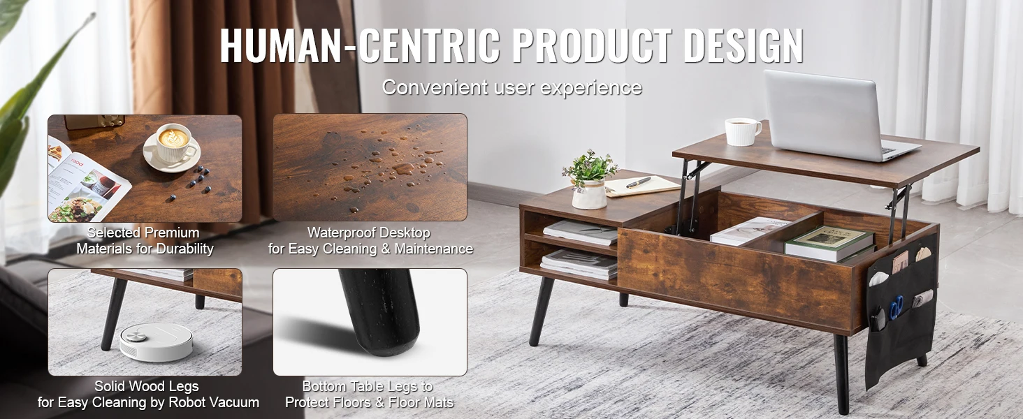This adjustable coffee table is crafted from high-quality materials, ensuring durability and resistance to wear. Its waterproof tabletop design facilitates easy cleaning and maintenance. The solid wood high-leg design allows robot vacuums to move freely, making cleaning effortless.
