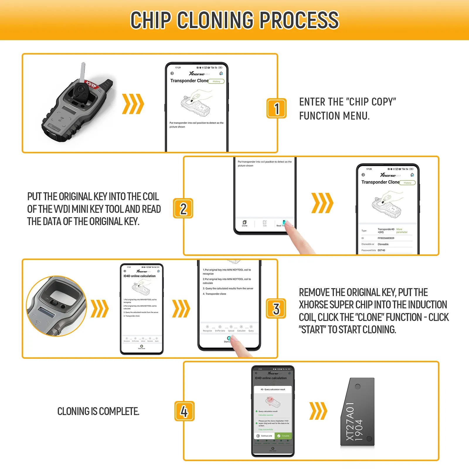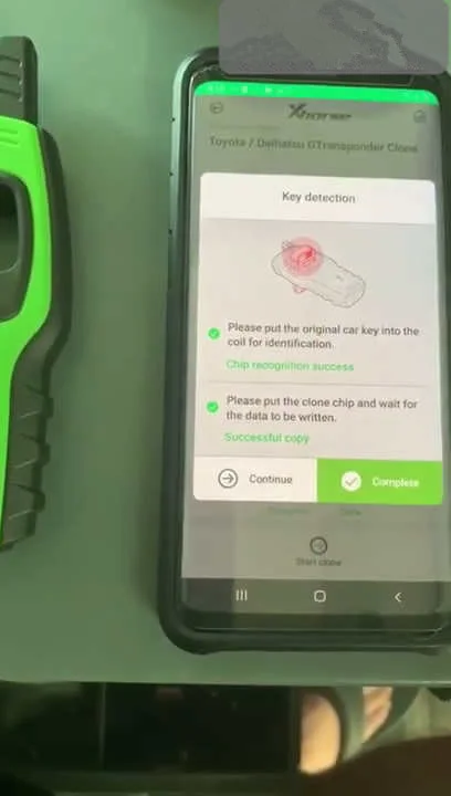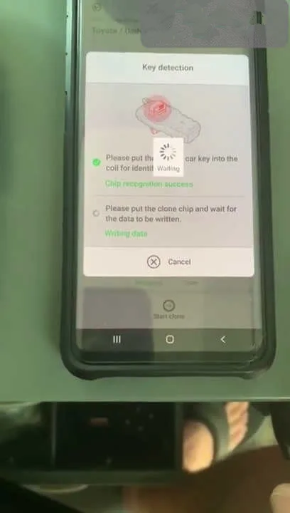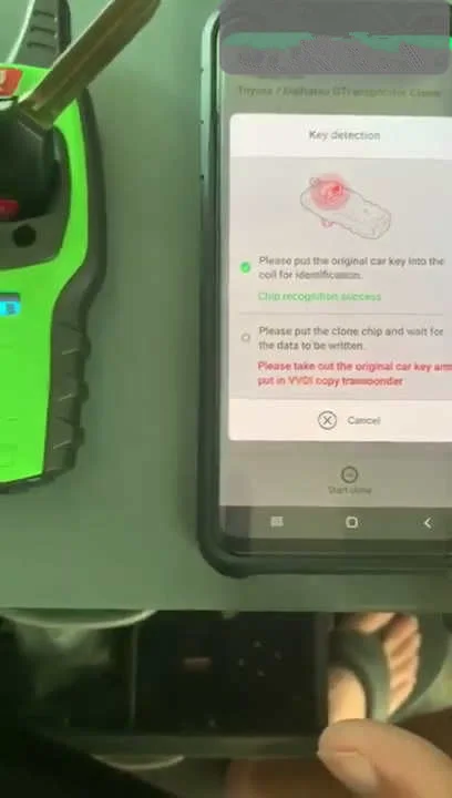 Remove the original key, Put the Xhorse Super Chip into the indication coil, click the "Clone" Function - Click "Start" to start cloning