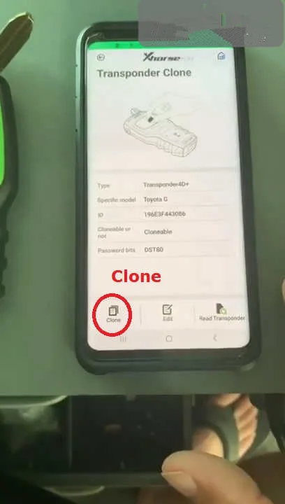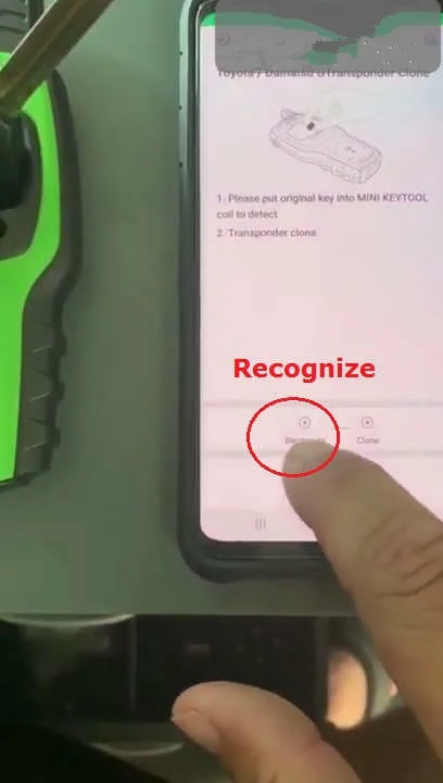 Read out the original for Toyota G key info, tap “Clone” (Transponder). Then tap “Recognize”.
