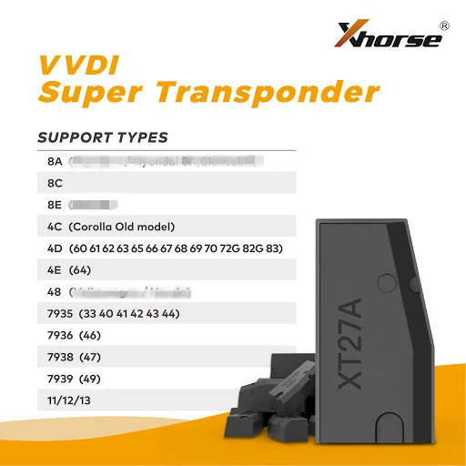 Wide Range Transponder Support: The Xhorse VVDI Super Chip supports various chip types, including 11, 12, 13, PCF7935, PCF7936, 4D(80), 8A, 8C, and 48, PCF7938 ID47, PCF7939 ID49, and much more.