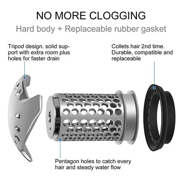 • NO MORE CLOGGING: Innovation design separate water and hair to the different path by a wise way, keep back the hair on the sealed rubber ring and let the water go through the small holes on the jamb wall of the cylinder, leaving you a clean surface and enough room for fast water drain.