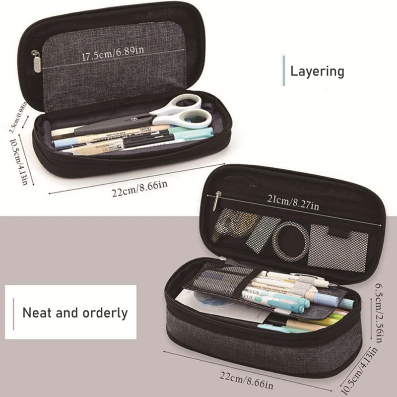 [High Capacity] Bigger size to storage 20cm rulers, great to store 100 pens; 5slots with mesh pocket to place frequently used pen, it also provides mesh zipper bag to store small stationery to prevent falling out; Dimensions: 22*6.5*11cm(8.66*2.56*4.33 inches)