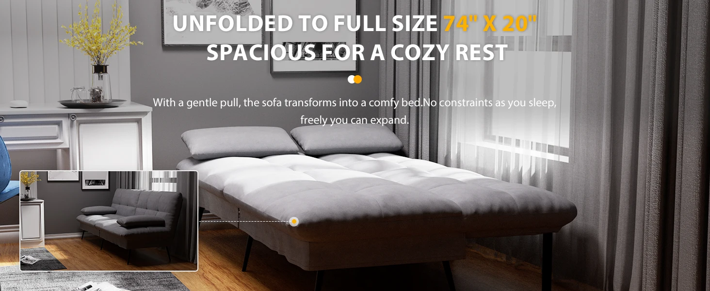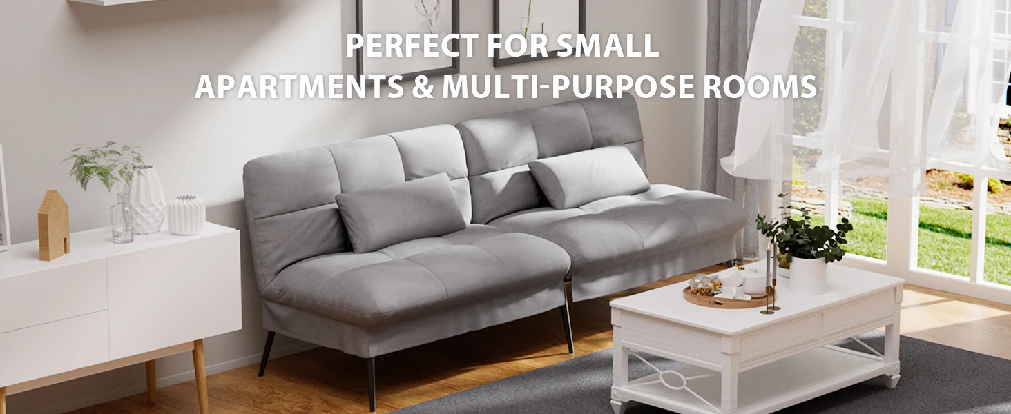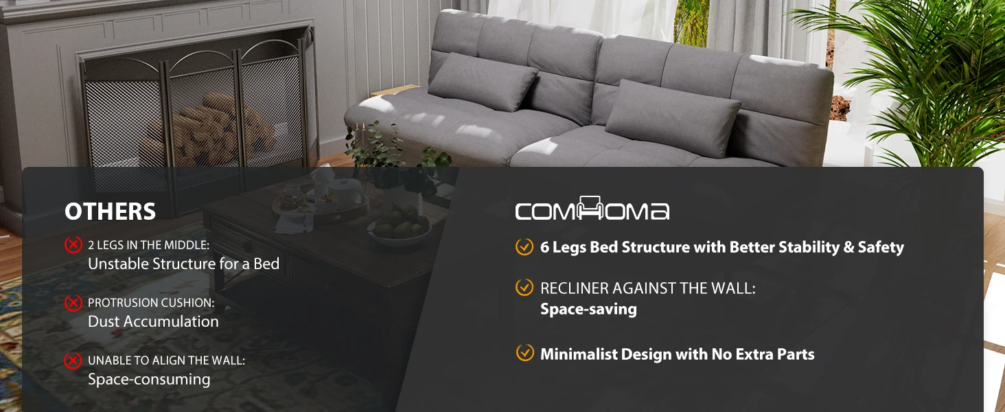 • 【Space Saving Design】 Rule no.1 in picking a sofa bed: Check the back! Many futon sofas have excess part behind the seat due to design flaws. These unnecessary elements not only take up home space but also collect dust. Just imagine holding a hot coffee and accidentally bumping into this unwanted excess part. Thanks to our upgraded frame design, our sofa has eliminated this unsightly and obstructive excess part in behind and enhanced stability by 40%. Simple, neat and robust.