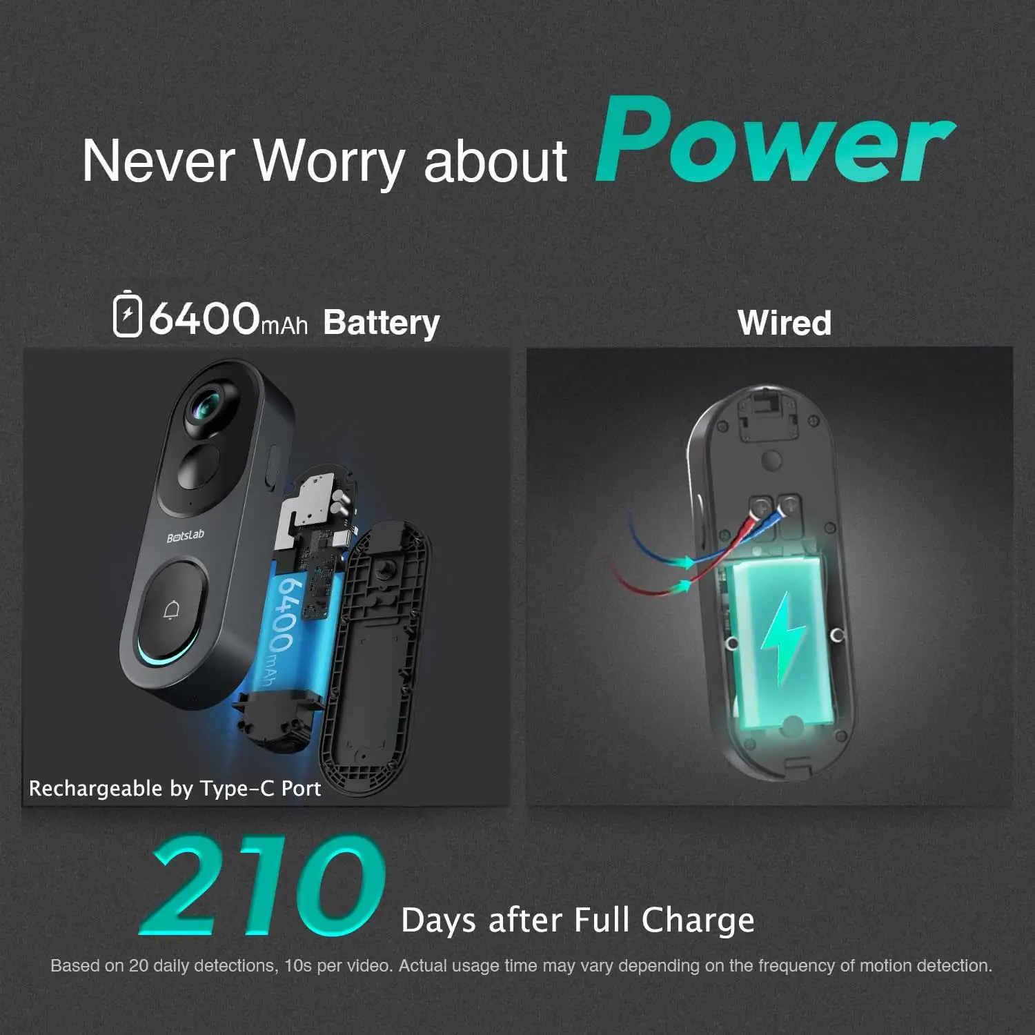 The wireless video doorbell camera lasts 210 days on a 6400mAh rechargeable battery.