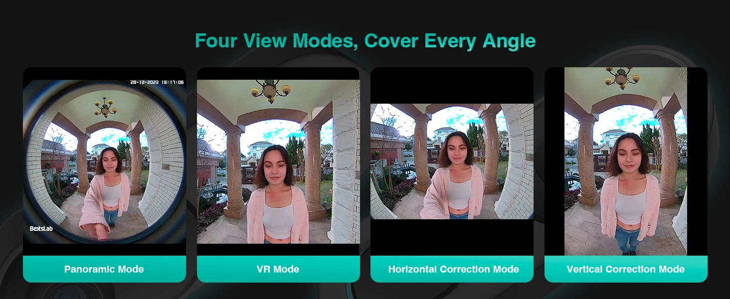 Whether it's a child or a package at your doorstep, the wireless video doorbell ensures you have a complete 180° Horizontal, 180° Vertical panoramic view in stunning 2240P resolution. Choose from four view modes (Panoramic, VR,Horizontal Correction, Vertical Correction) to effortlessly cover every angle.