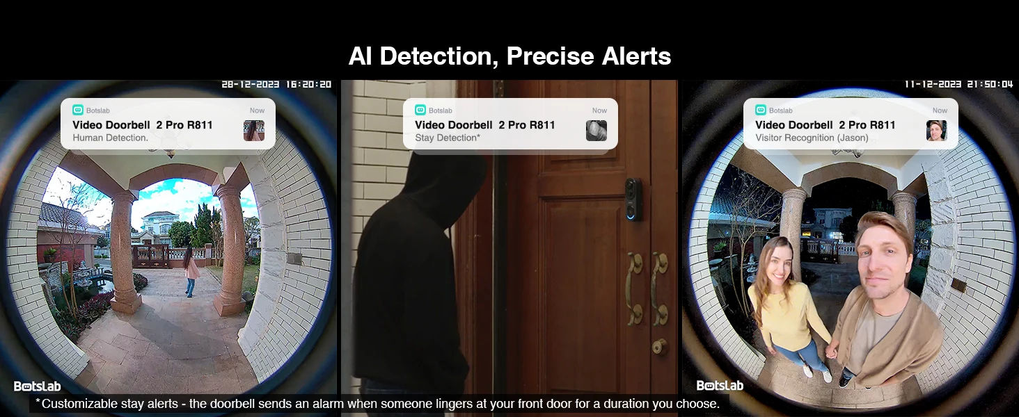 BOTSLAB battery video doorbell provides AI detection for accurate alerts, including human detection, stay detection, and visitor recognition. The combination of radar and PIR detection minimizes false alerts. Customize your detection distance to focus on where matters. Communicate effectively using crystal-clear two-way audio, enhanced by voice modulation for added privacy.