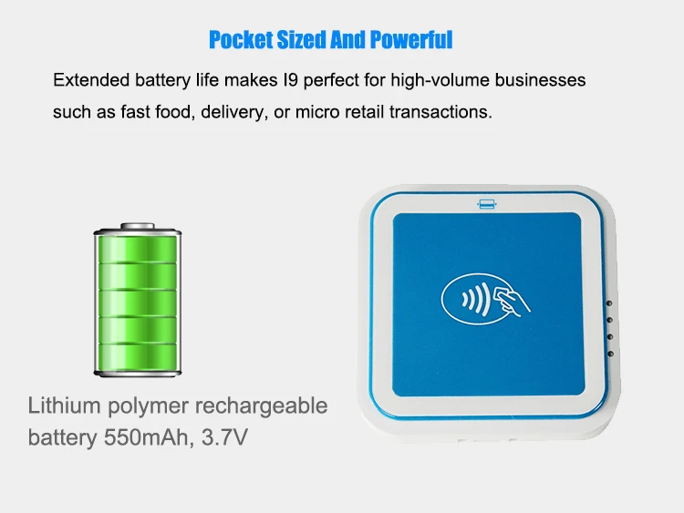 Extended batterylife makes I9 perfect for high-volume businesses like fast food, delivery, or micro retail transactions.