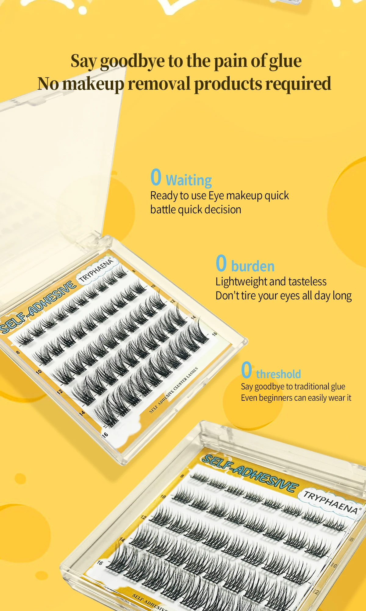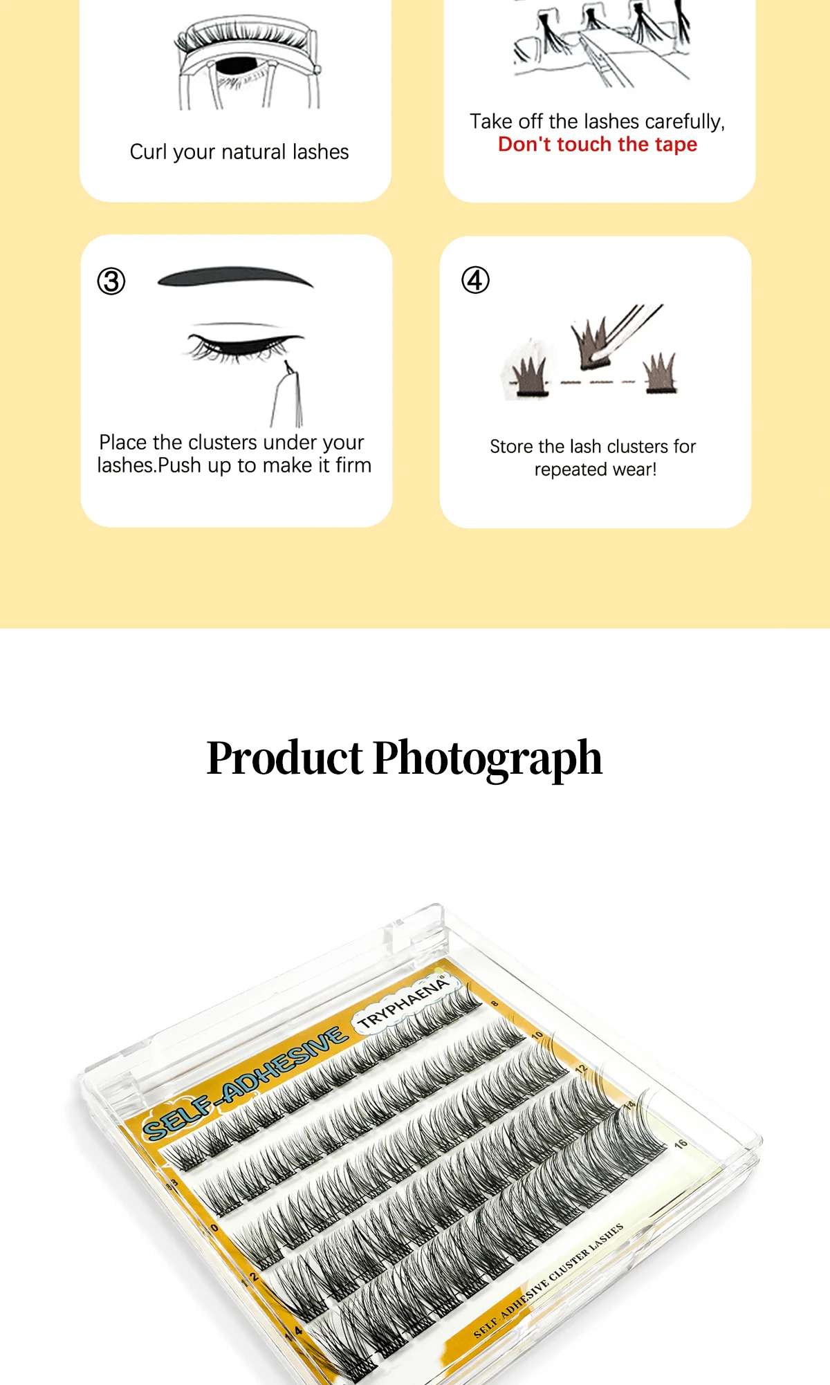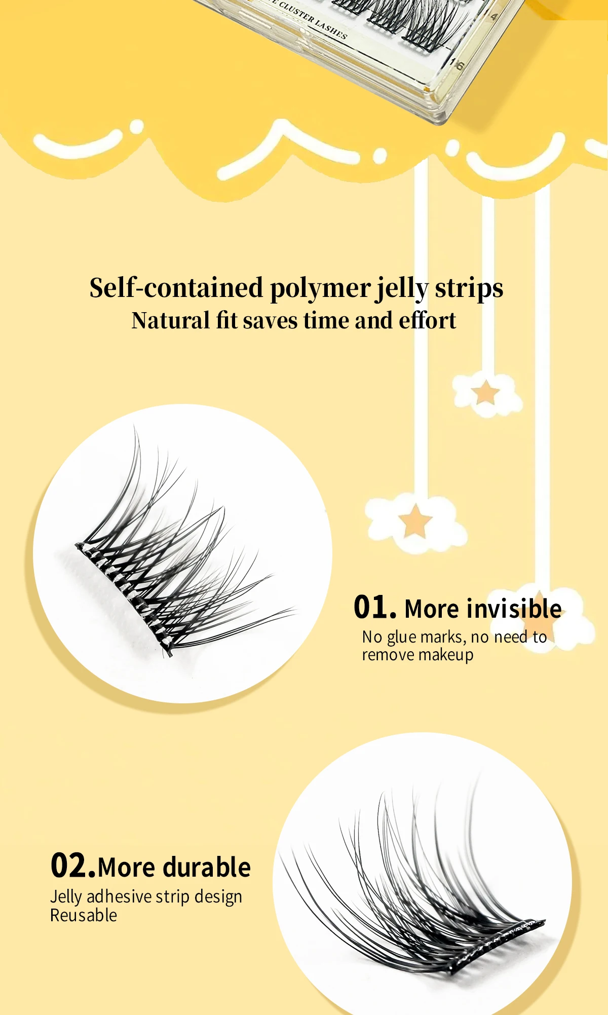 【Easy Removal, No Residue】After using, the self adhesive lash clusters can be taken off just by finger—no lash glue remover required. The easy removal method is gentle, harmless to your natural lashes as well. After removing, there won't be any residue left.