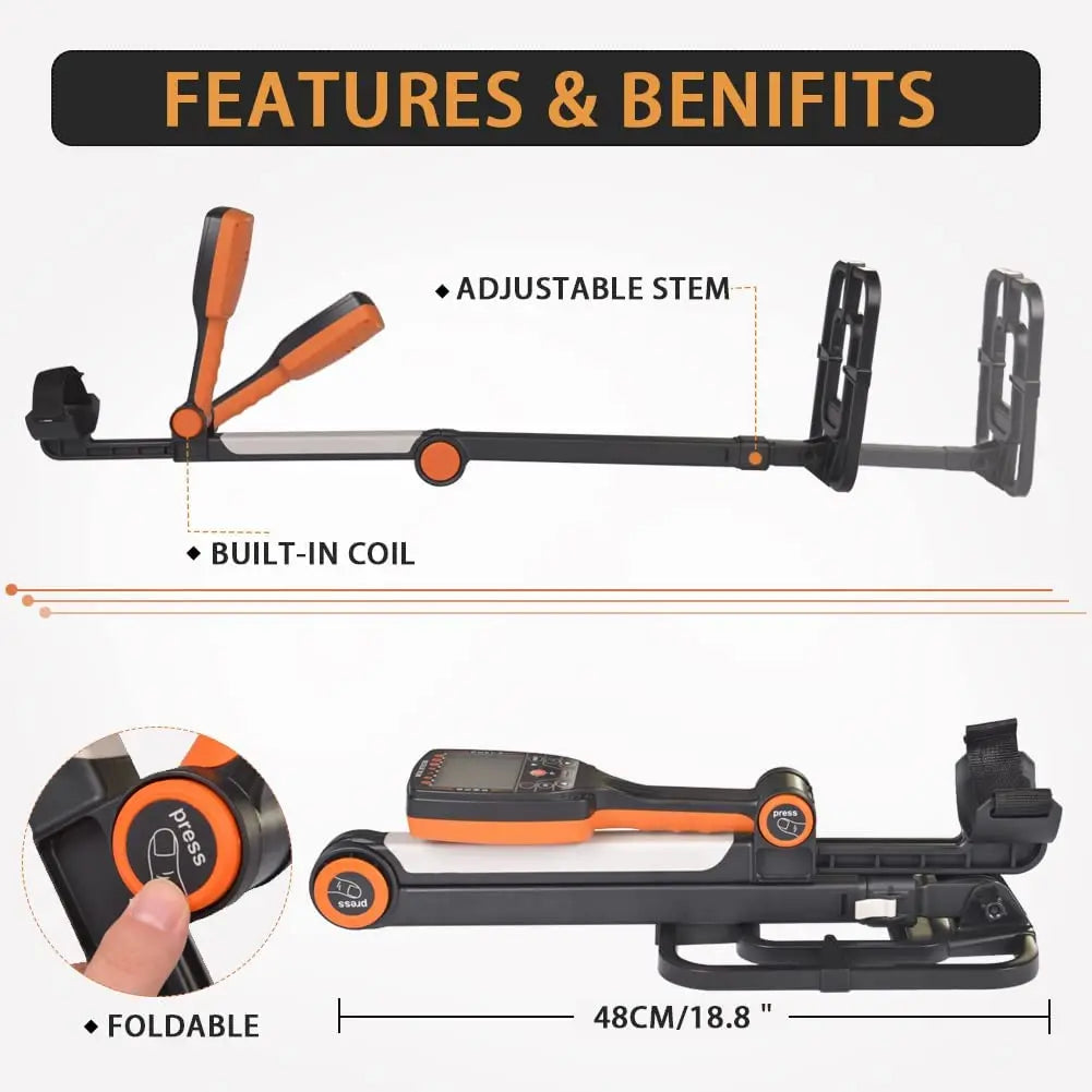 [Adjustable Wand & 9.8” Waterproof Search Coil] 34.6" to 42.5" adjustable stem is suitable for adults or kids of different heights. The line is hidden inside the adjustable rod, which is not easy to damage and is more beautiful. The waterproof metal detector allows you to use underwater detection, which is suitable for you and your kids to go outdoor treasure hunting, such as beaches, streams and yards. (Note: The control box is not waterproof)