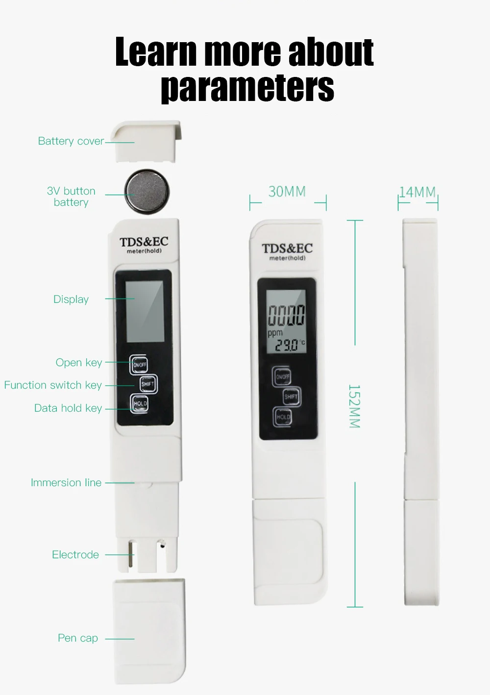 Powered by 1 PC 3V CR2032 battery(not incl) that can process approximately 1000 hours continuously, ideal tools for water purifiers, swimming pools, laboratories in waterworks, CDC, aquaculture farms, etc.