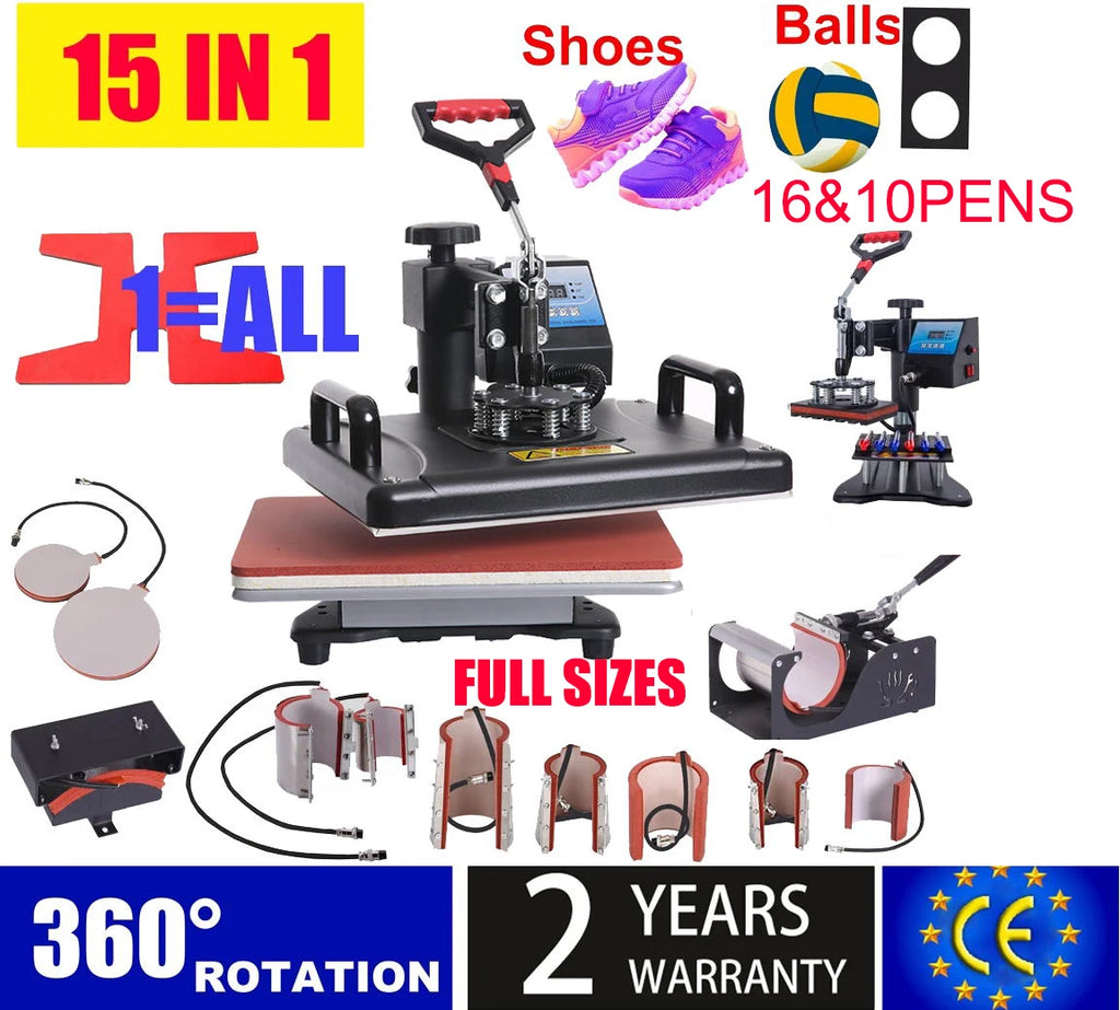 15 IN 1 NEW DESIGN COMBO HEAT PRESS MACHINE = 8 PCS mug press pad (different size) + 1 set cap press pad + 1 set flat T-shirt pres pad + 2 PCS plate press machine+1 PCS shoe part + 1 PCS football part