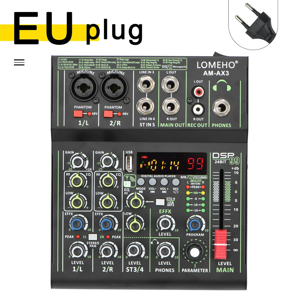 4 Channel Audio Mixer Individual +48V Phantom Power 99 DSP Effects Bluetooth USB Computer Play Record Mixing Console for home party,karaoke,singing, ect.