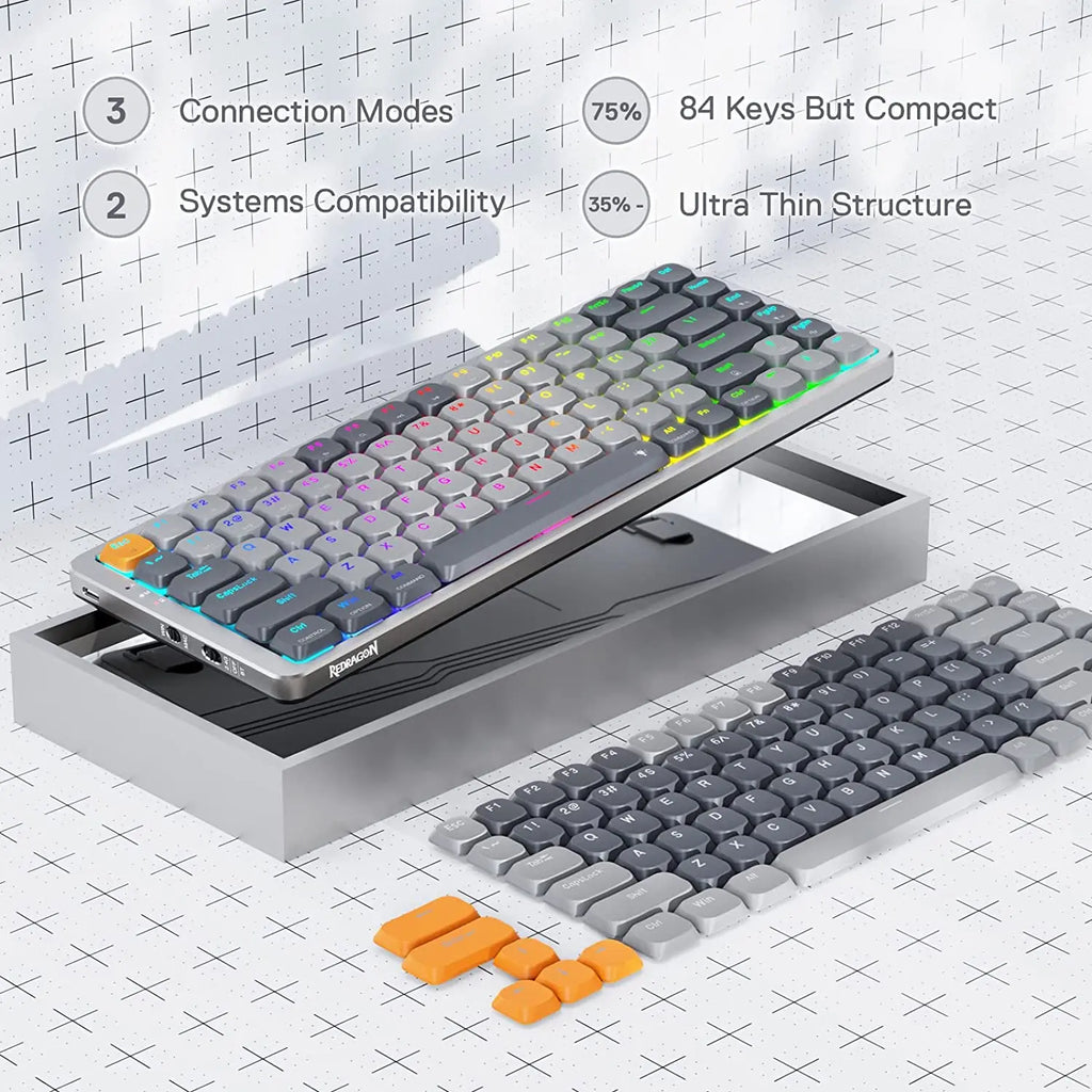 Redragon K652 75% Wireless RGB Mechanical Keyboard, Bluetooth\/2.4Ghz\/Wired Tri-Mode 84 Keys Ultra-Thin Gaming Keyboard