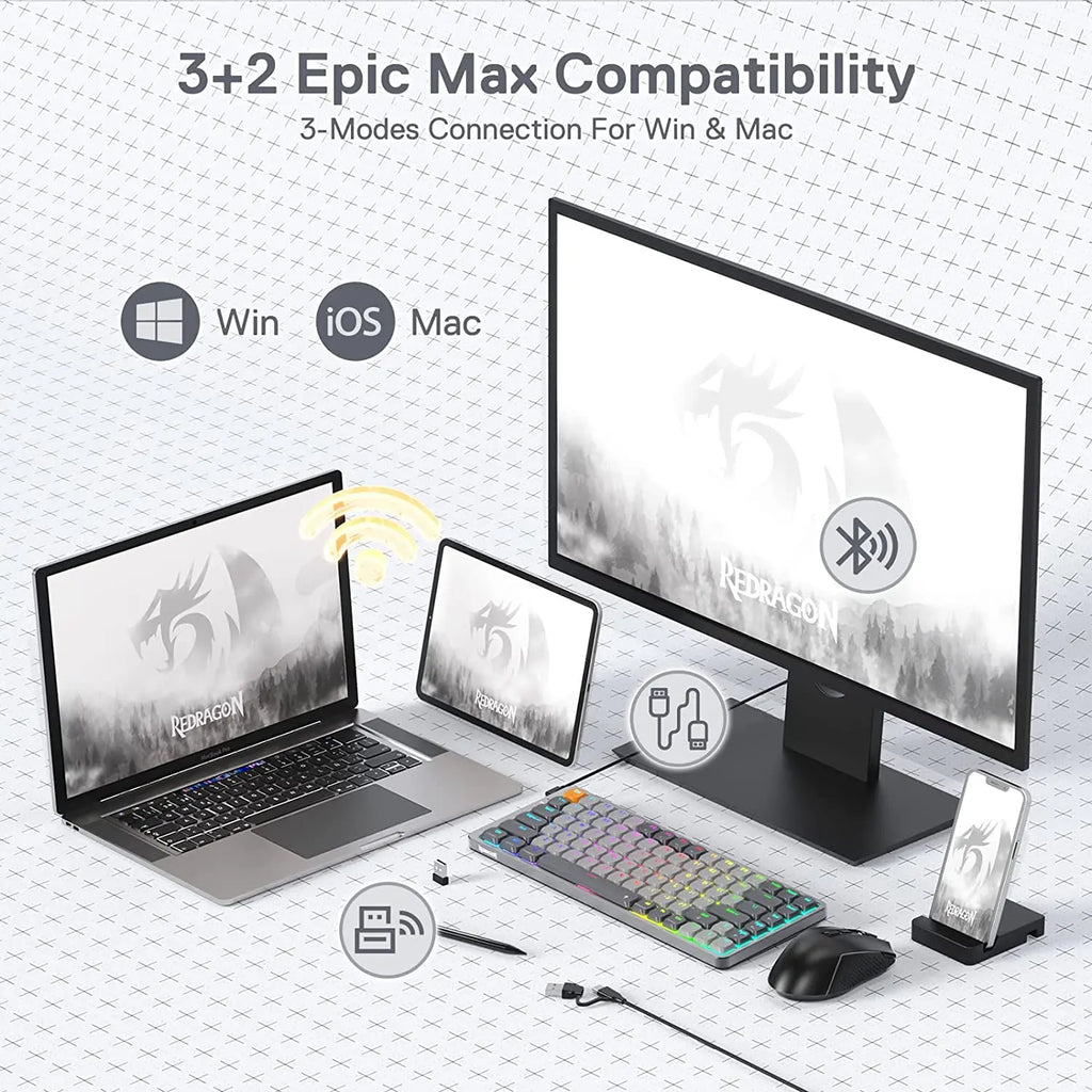 3-Mode Connection - Geared with Redragon advanced tri-mode connection technology, USB-C wired, BT 3.0/5.0 & 2.4Ghz wireless modes which make the user experience upgraded to another level in all fields.