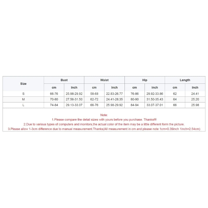 Size:S Bust:66-76cm(25.98-29.92inch) Waist:58-68cm(22.83-26.77inch) Hip:76-86cm(29.92-33.86inch) Length:62cm(24.41inch)