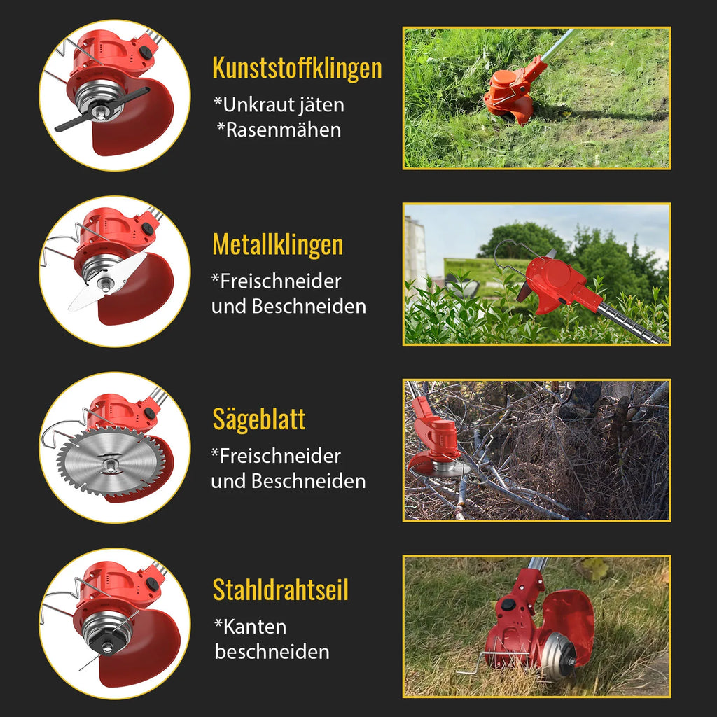 • 【4-in-1 Blades】This electric strimmer has 4 types of blades, cordless grass trimmer suitable for different scenarios. The 6-inch metal circular blades can cut branches and hard bushes, two 6-inch metal blades can cut weed piles and thicker grass in complex terrain, 2 wire rope and 10 plastic blades can be used to trim lawn tender grass or lawn edge. You can use it in gardens, villas, parks, pastures, courtyard lawns, weed piles, bushes, especially for home gardens.