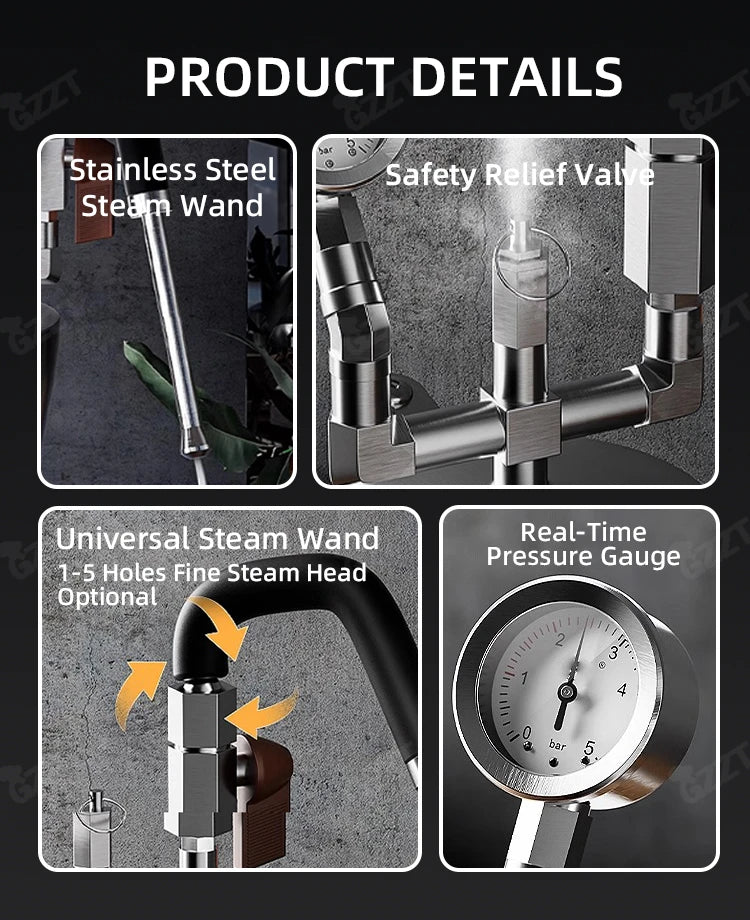 5. Multifunctional Steam Nozzle: Comes with a universal steam wand, with optional fine steam heads with 1-5 holes to meet different frothing needs.(Default 3 holes).