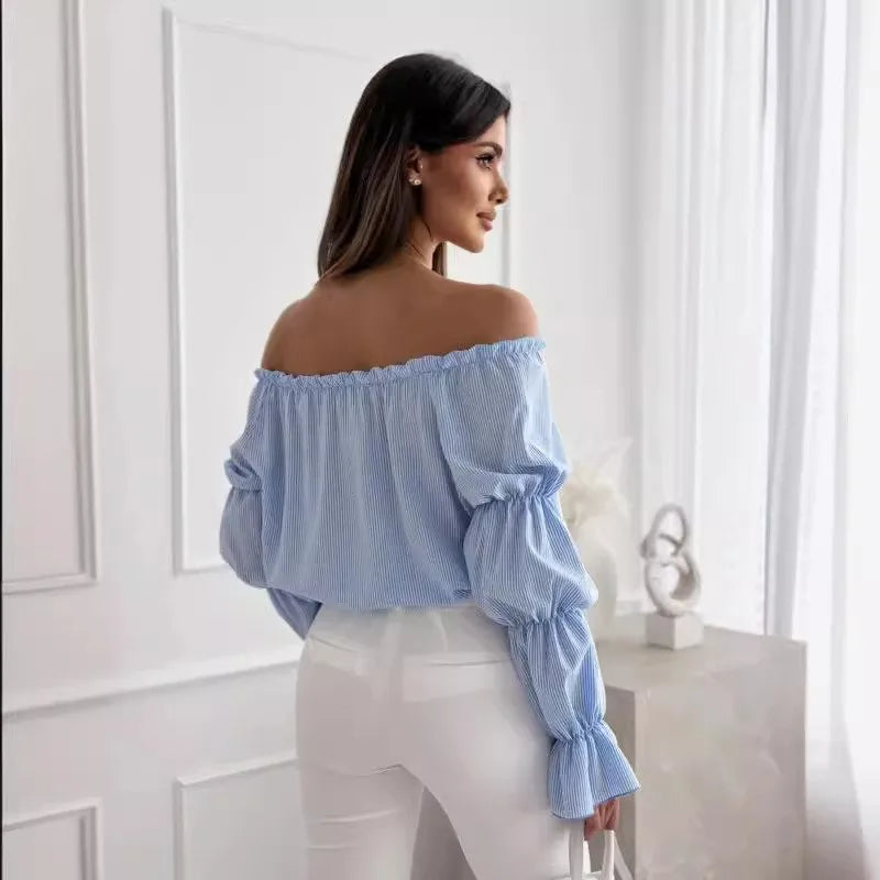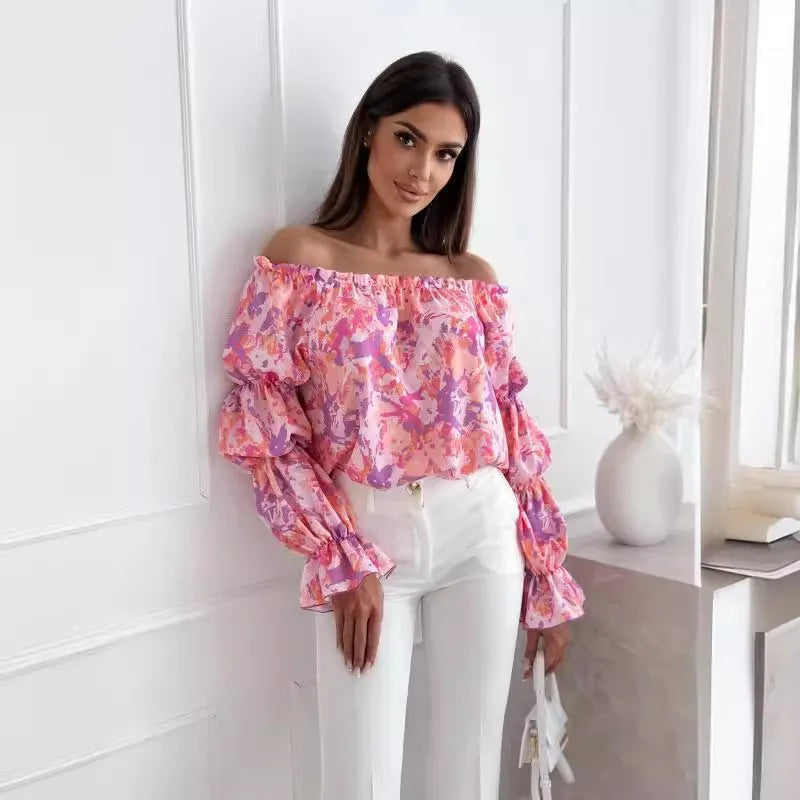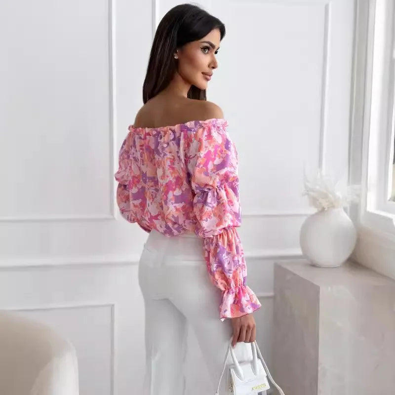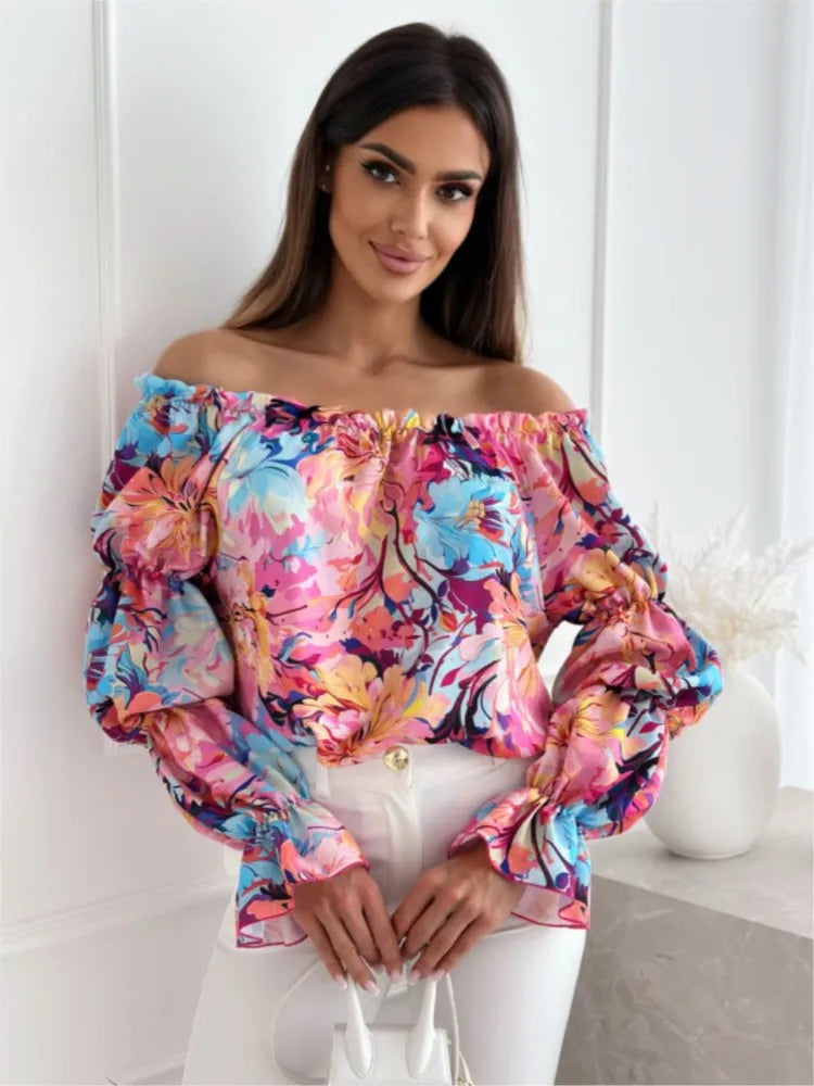 Floral Print Sexy One-shoulder Shirt Women Elegant Fashion Pleated Off Shoulder Blouse For Women 2024 Casual Loose Ruffles Tops