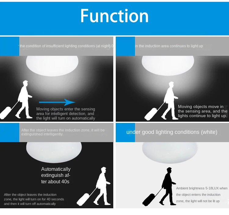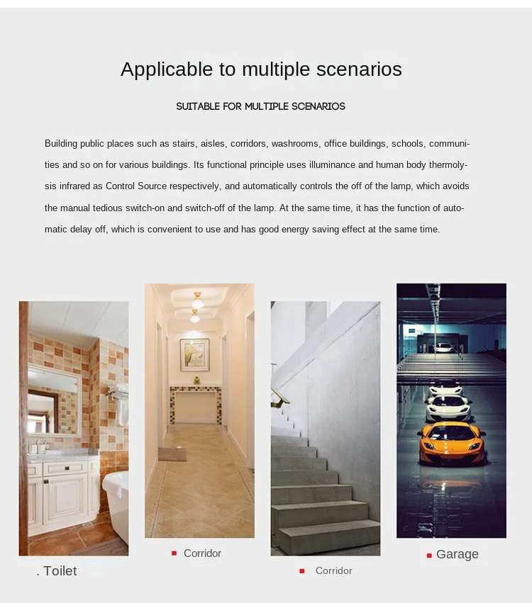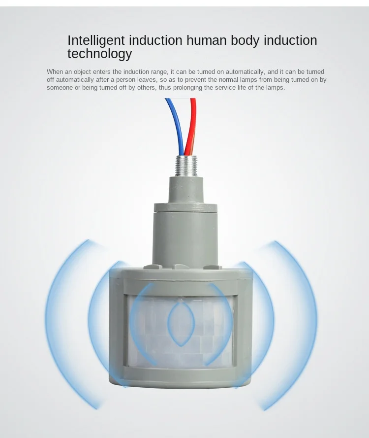 3. When a person enters the sensing range, it can be automatically turned on, and after a person leaves, it can be automatically turned off after a delay. This eliminates the artificial waste of conventional lamps that are turned on or turned off by no one, prolongs the service life of the lamps, and integrates energy saving, convenience and environmental protection.