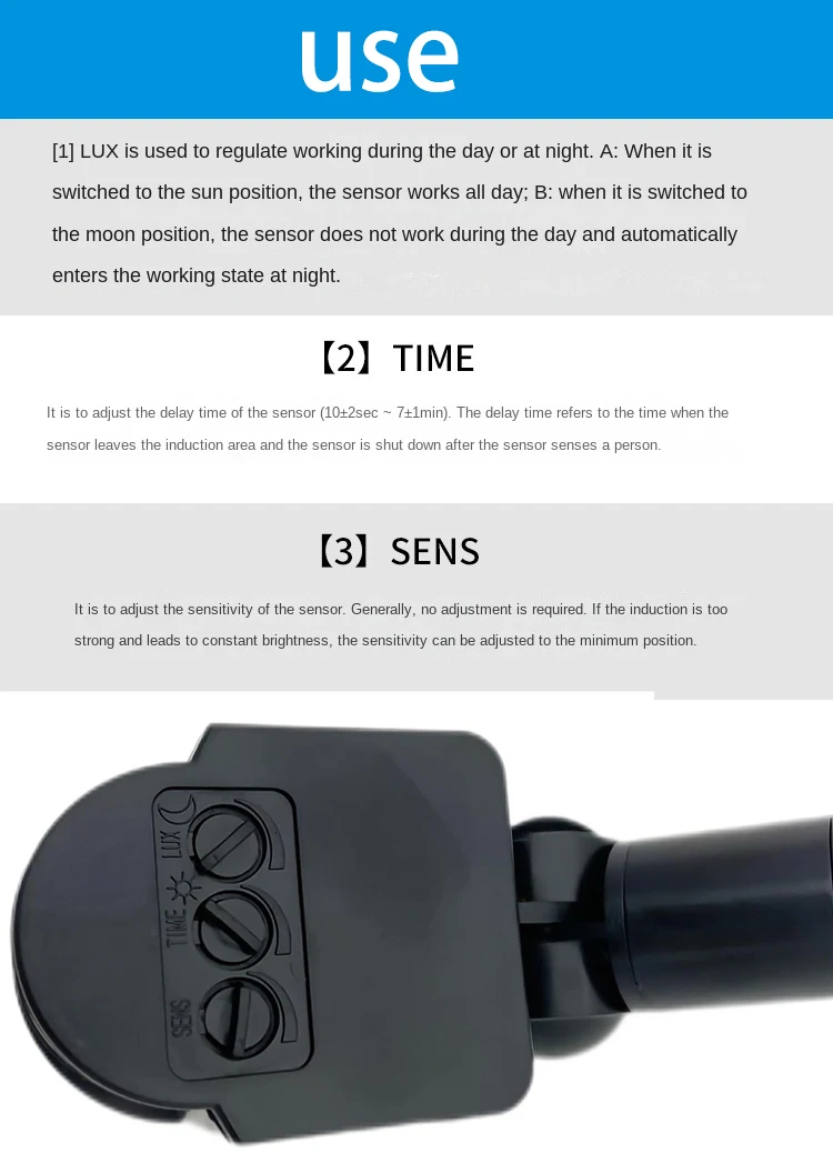 It is to adjust the sensitivity of the sensor. Generally, no adjustment is required. If the induction is too strong and the light is always on, you can adjust the sensitivity to the minimum position.