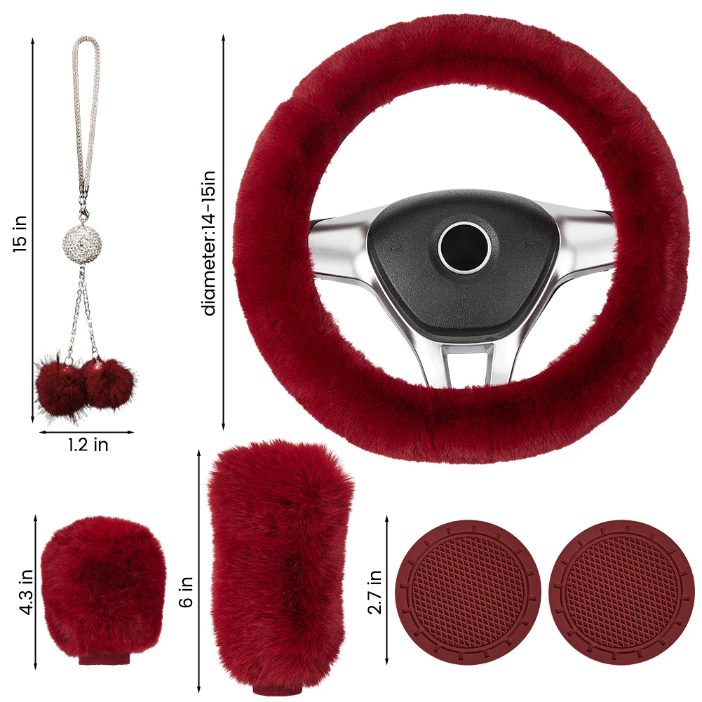 6Pcs Plush Car Accessories Set Plush Steering Wheel Cover Soft Fuzz Handbrake Gear Shift Cover Bling Mirror Ornament