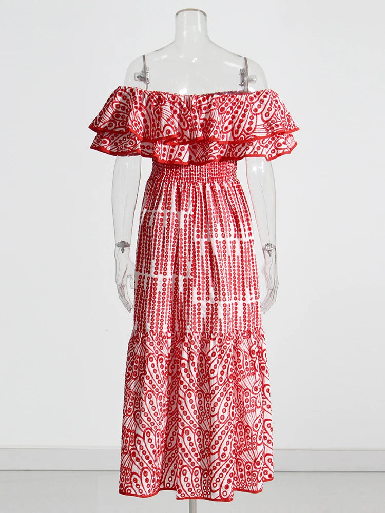 TWOTWINSTYLE Embroidery Elegant Dress For Women Slash Neck Short Sleeve High Waist Cut Out Midi Dresses Female Summer Clothing