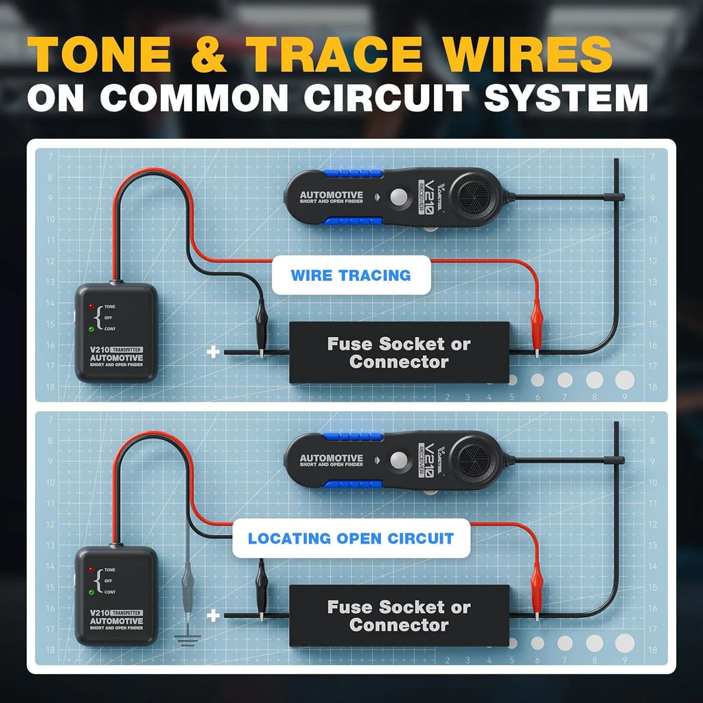 VDIAGTOOL V210 short & open finder tool is an advanced automotive diagnostic tool designed to efficiently locate short circuits, check open circuits, and trace wires with precision. Its non-invasive technology ensures accurate identification of wire and cable issues without damaging the insulation, making it an essential tool for automotive professionals and enthusiasts.