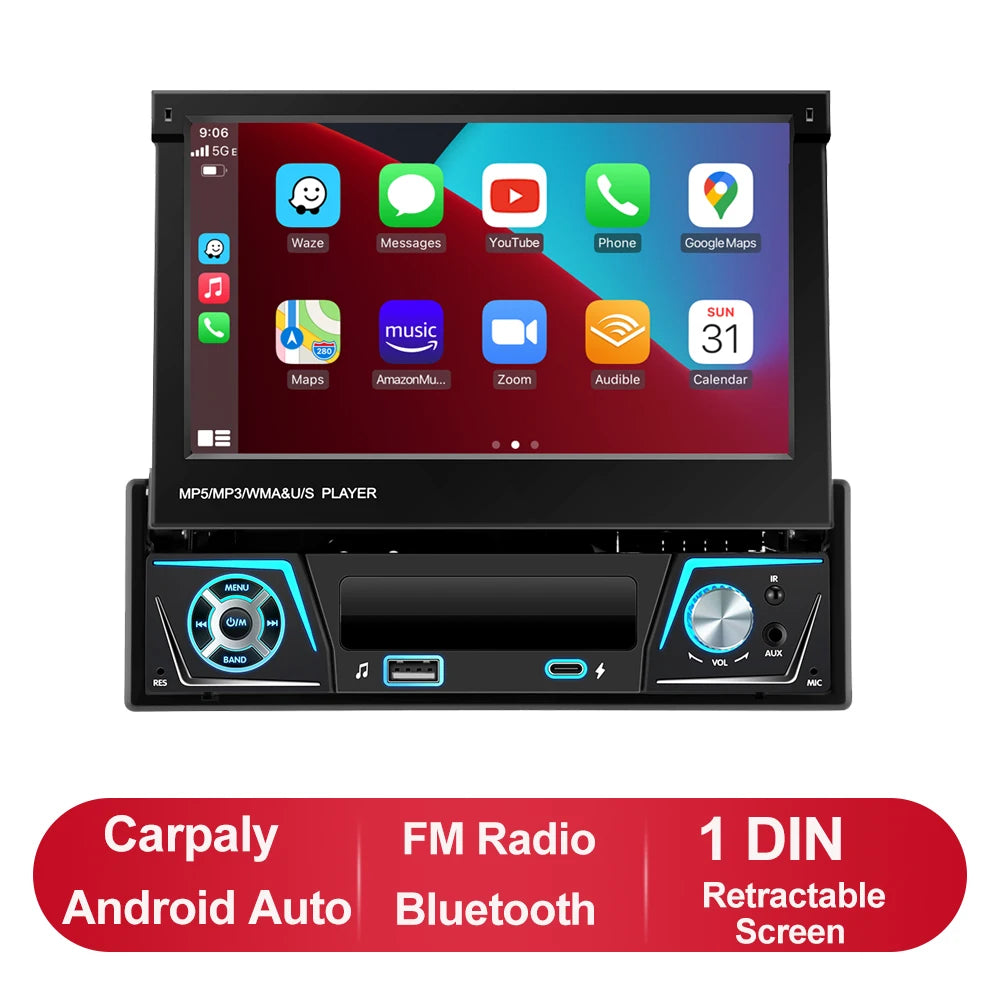 Universal 7" IPS Retractable Screen 1 din Car Radio Android Carplay Auto gps Navigation 1Din Android 13 Multimedia Video Player