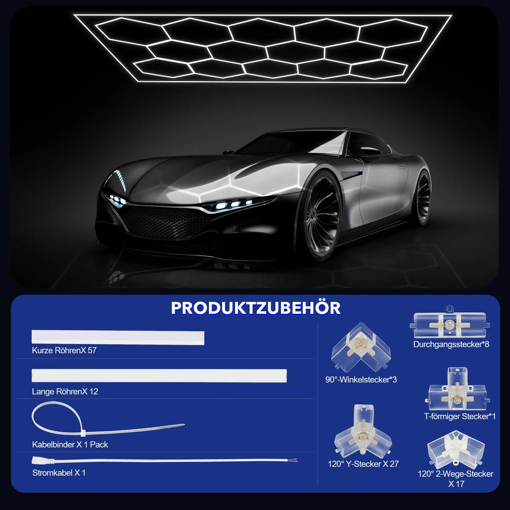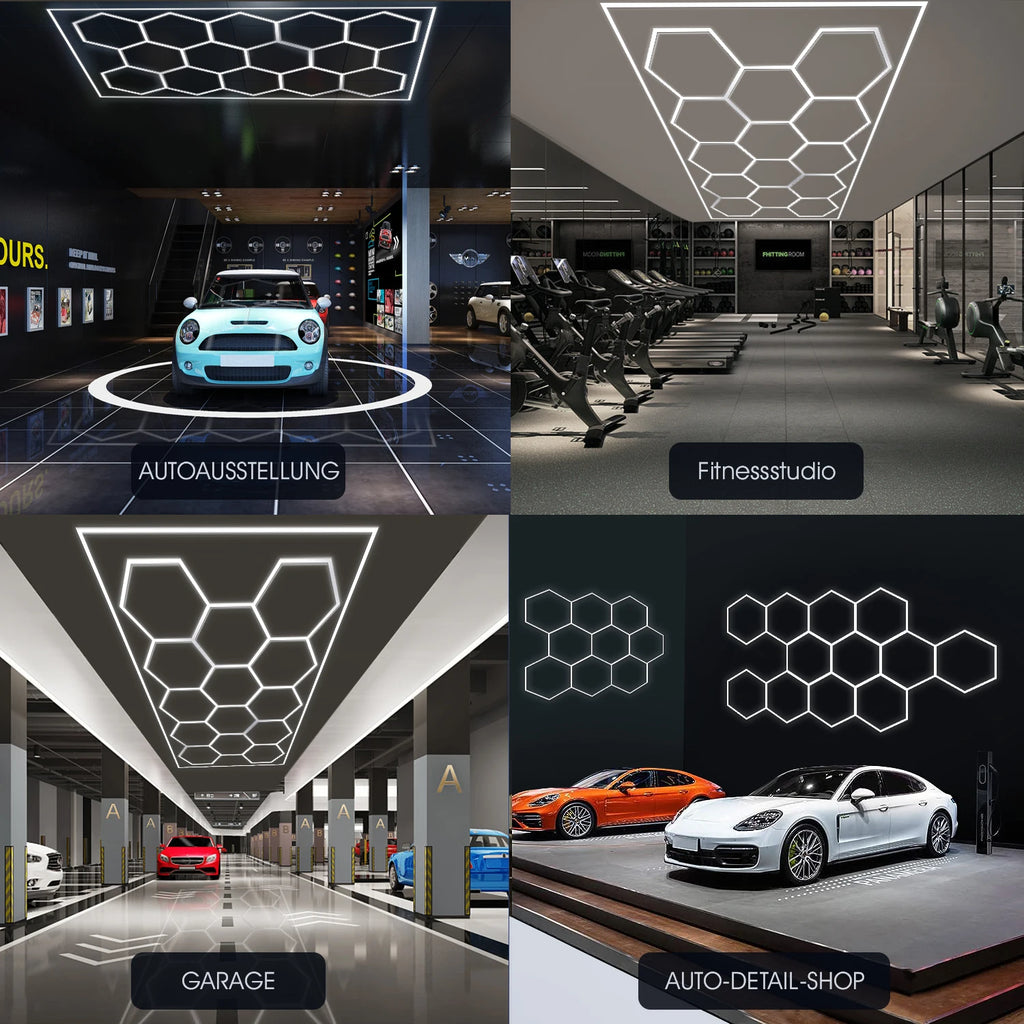Honeycomb Structure: The hexagonal 680W LED garage light consists of 84 light tubes (14 hexagonal lights). The design inspiration comes from the stable and simple honeycomb structure.