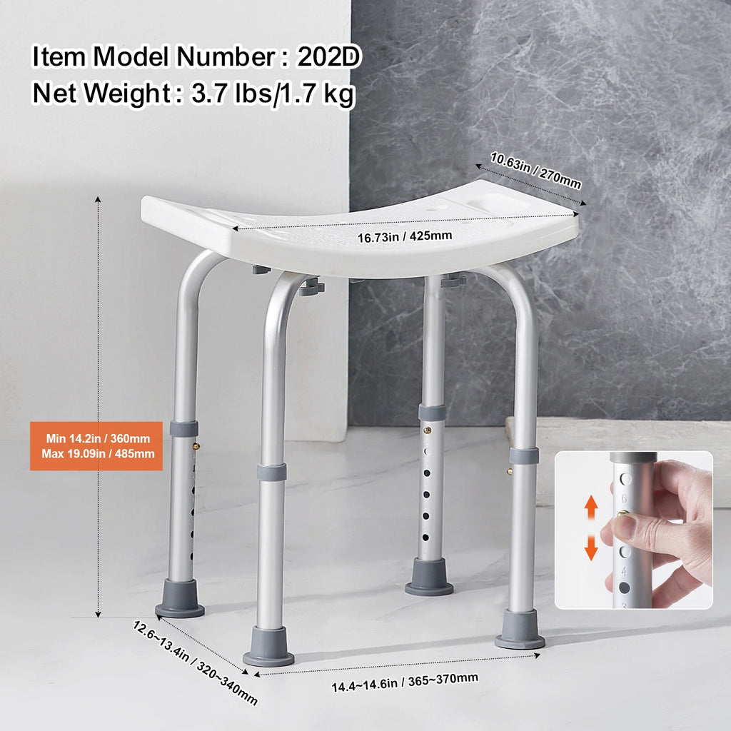 Adjustable Comfort: Customize your comfort with the adjustable height feature. The bath stool has 6 settings ranging from 14.2 to 19.09 inches, with 1-inch increments. The spring-loaded push-button keeps the height secure.