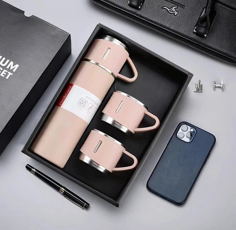 caneca Kit Garrafa Térmica Vacuum Bottle Inox 500ml + Xícaras Bebidas Fria ou Quente