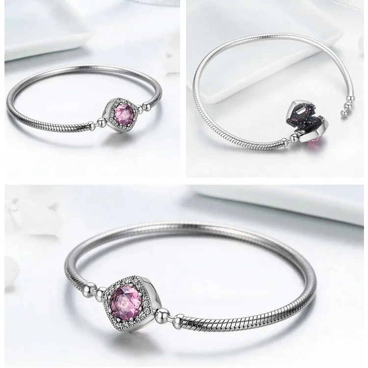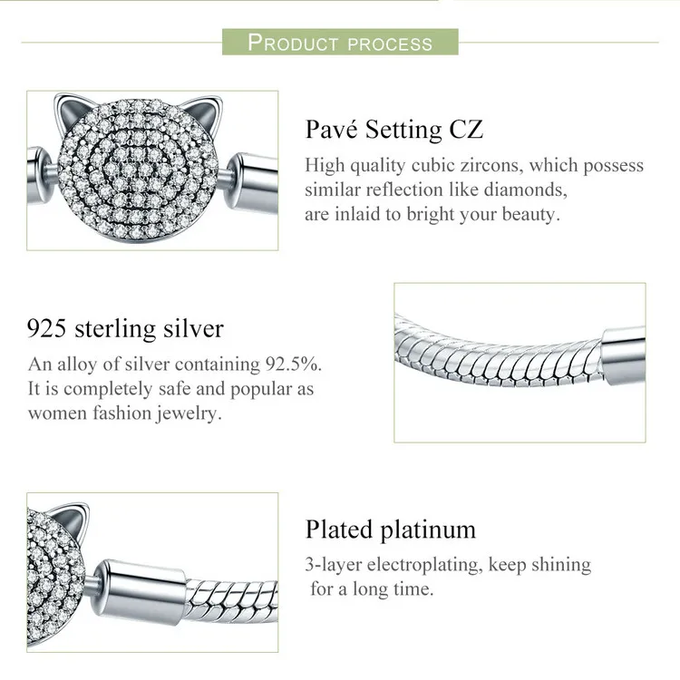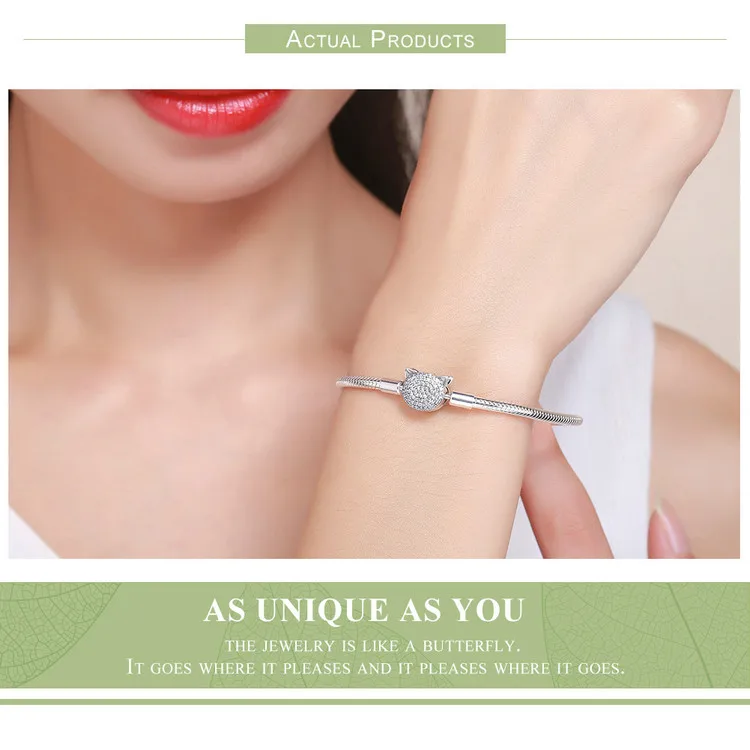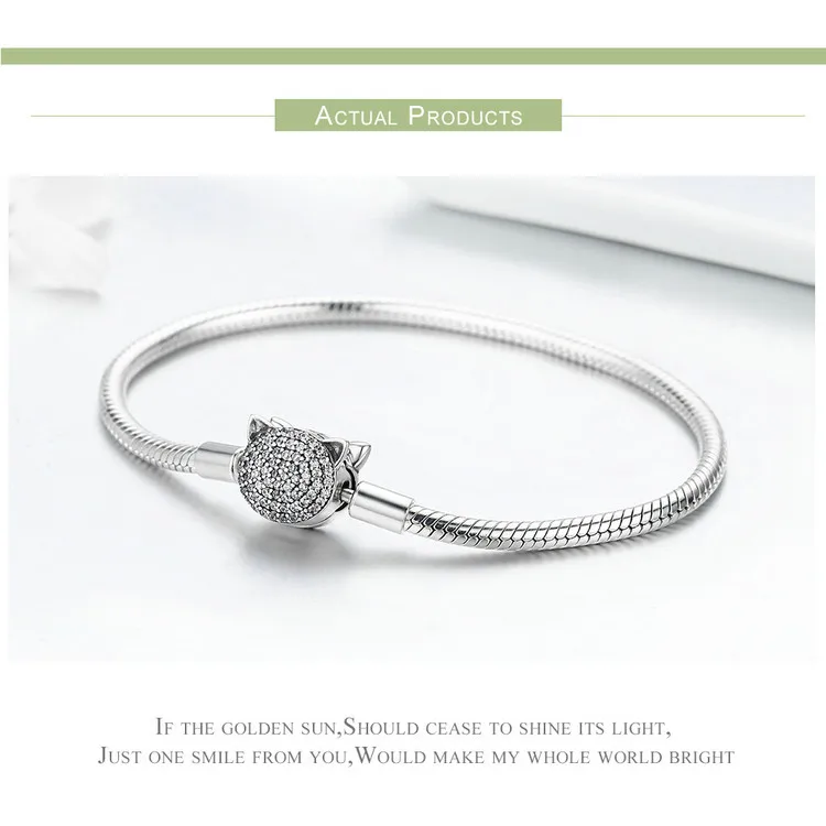 WOSTU Authentic 100% 925 Sterling Silver Cute Cat Glittering CZ Snake Strand Chain Bracelets Bangle for Women Silver Jewelry