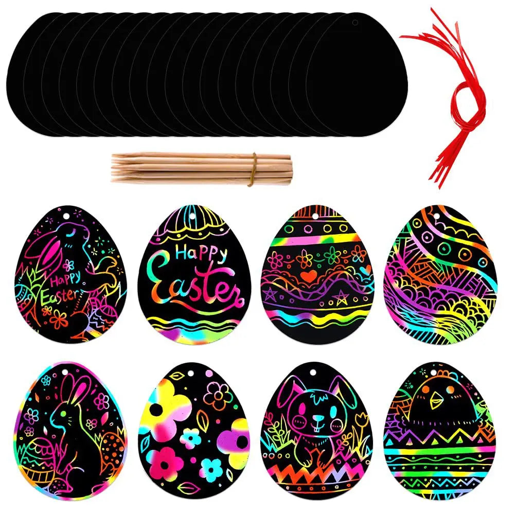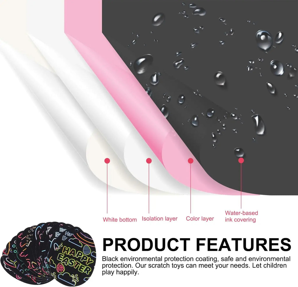 【Safe Material】Easter crafts for kids are made of thick paper with natural black coated layers on the surface. The wooden stylus is made delicately with smooth surface and not easy to bend. The scratch art is durable, odorless and safe, which is nice for kids to make handicrafts