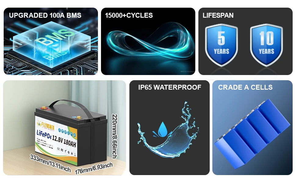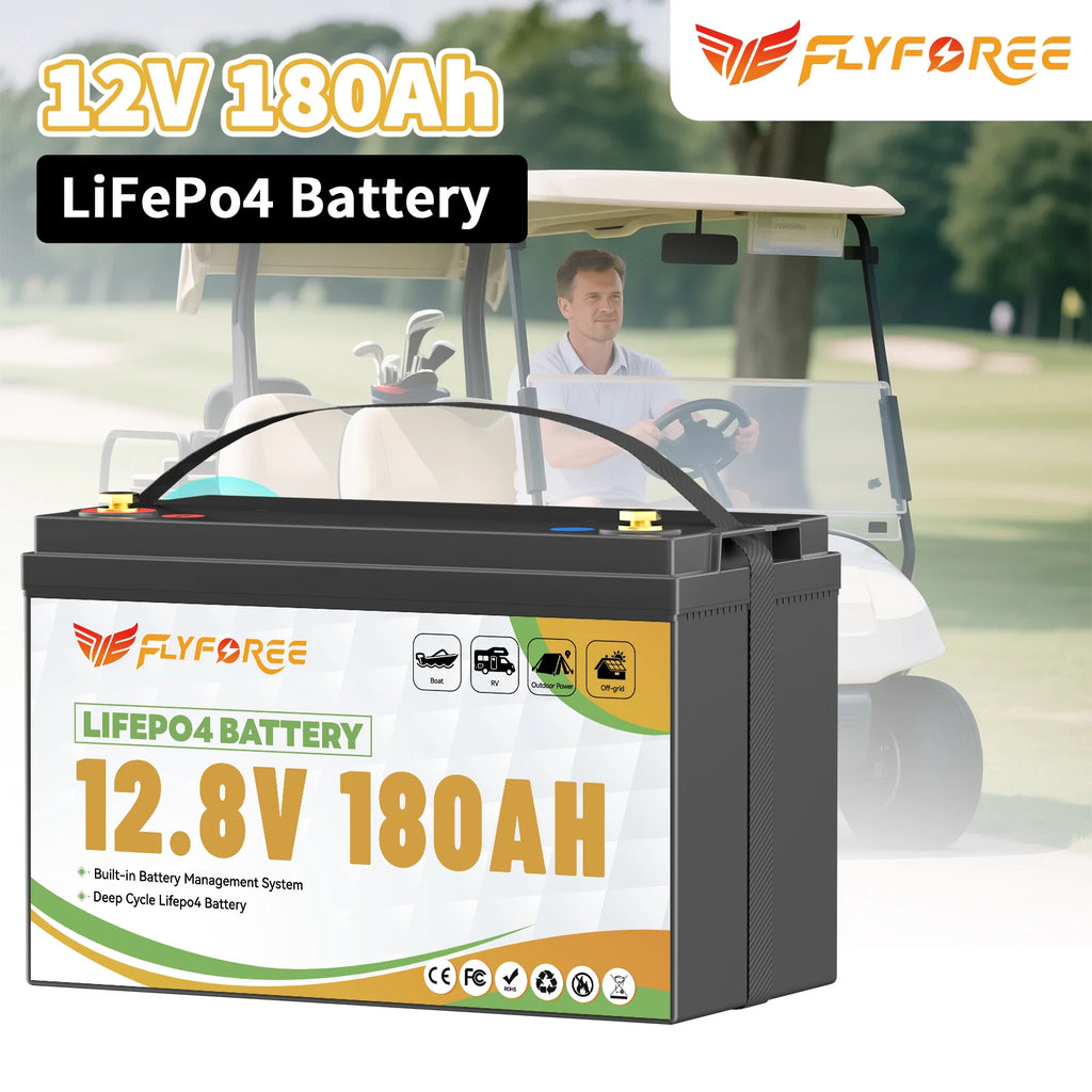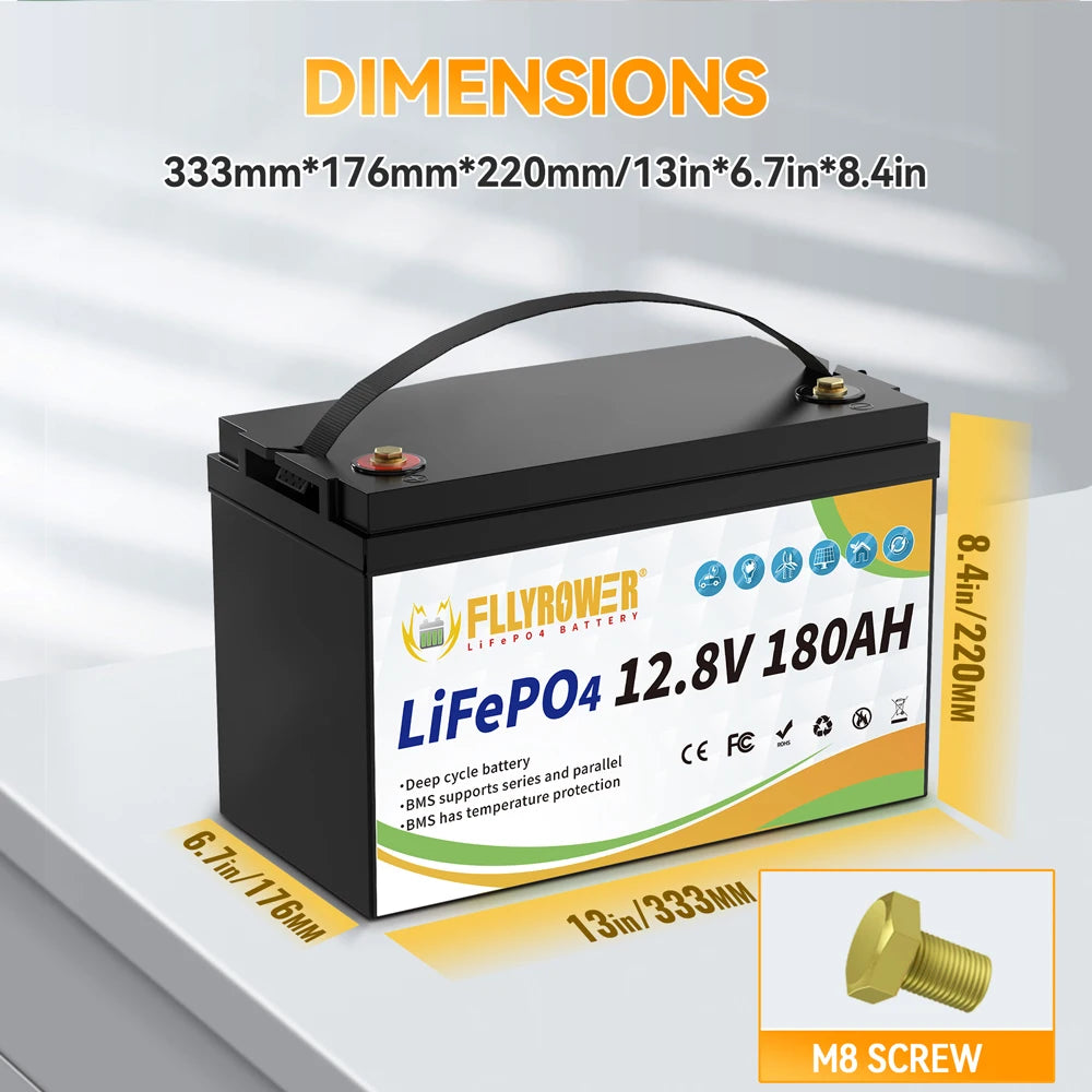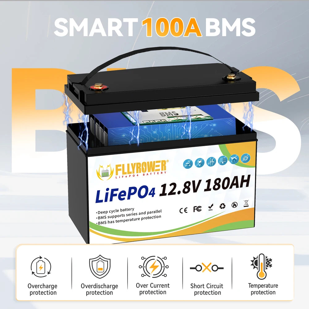 FLLYROWER 12V 180AH LiFePO4 Lithium Battery Pack With Charger 8000+Cycles BMS 100A For Touring Campers Off-Road Solar Wind