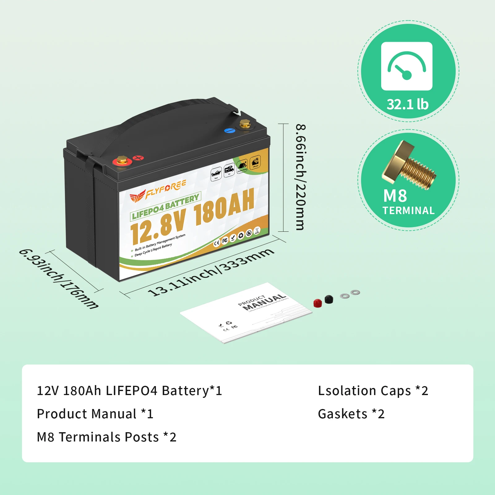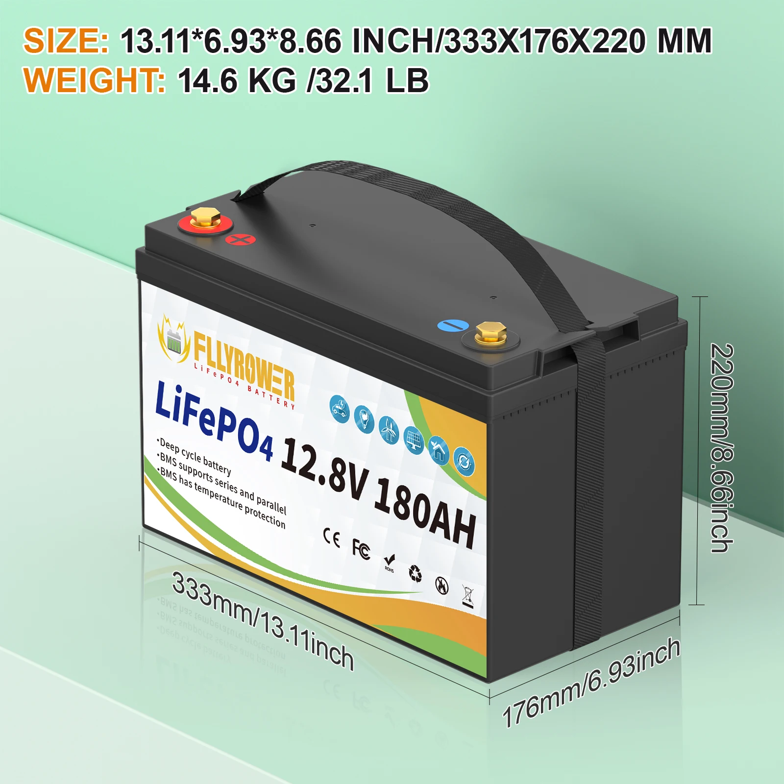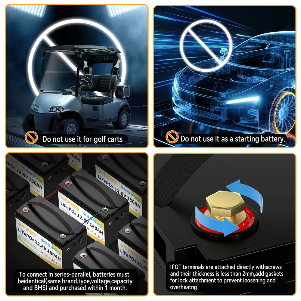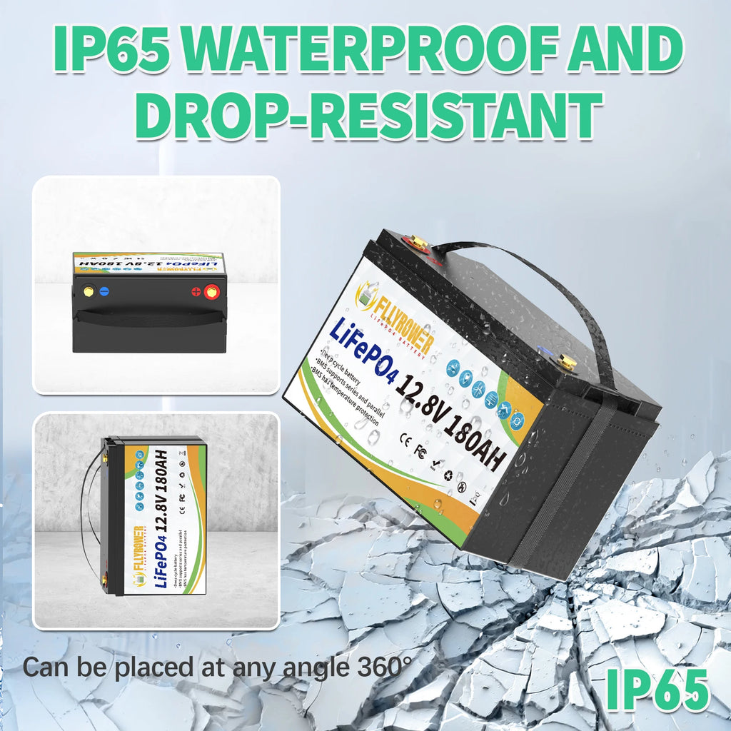 FLLYROWER 12V 180AH LiFePO4 Lithium Battery Pack With Charger 8000+Cycles BMS 100A For Touring Campers Off-Road Solar Wind