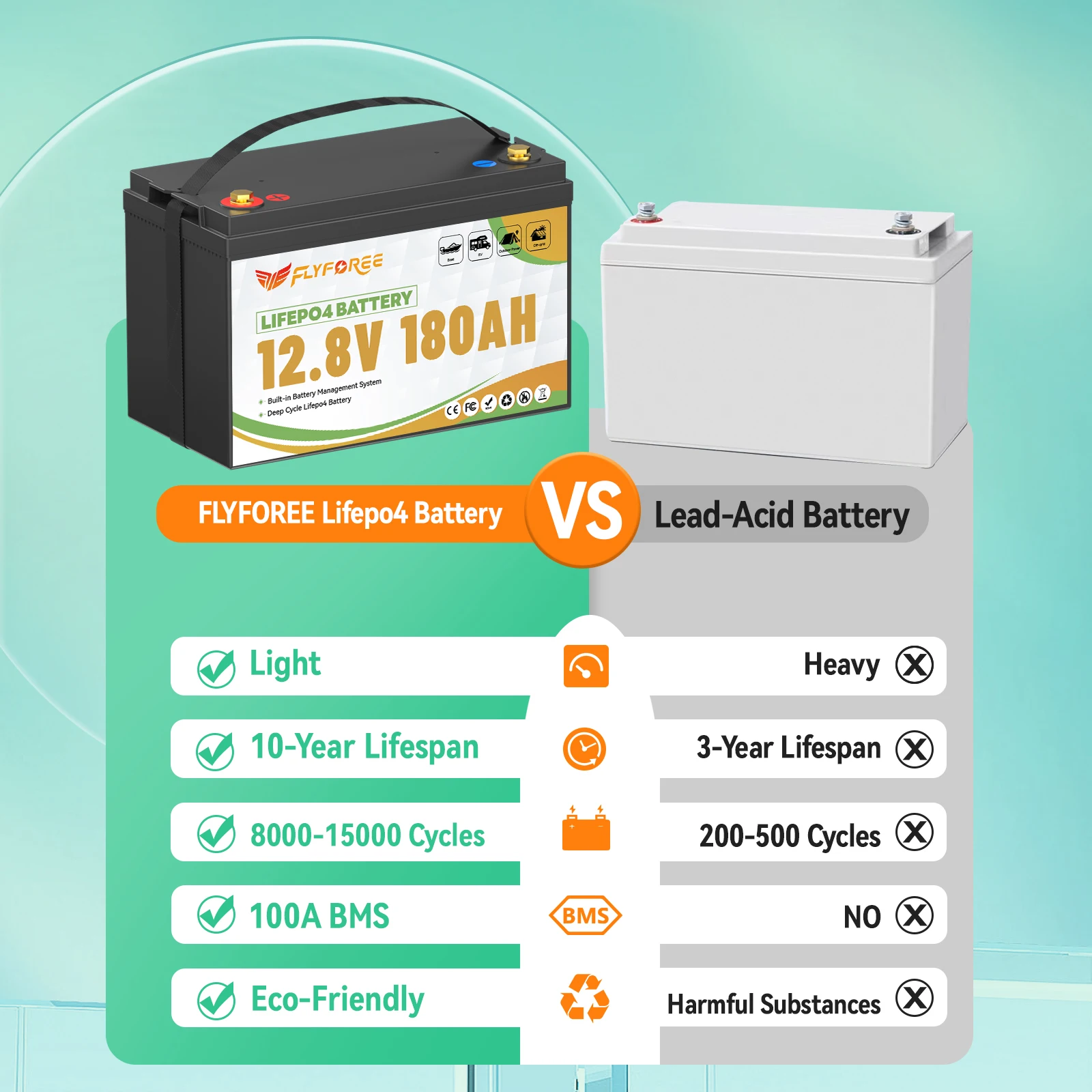 【Up to 8000+ Deep Cycles】 12V 180Ah LiFePO4 battery can reach 5000~15000 deep cycles, which is equivalent to 3 lead-acid batteries.