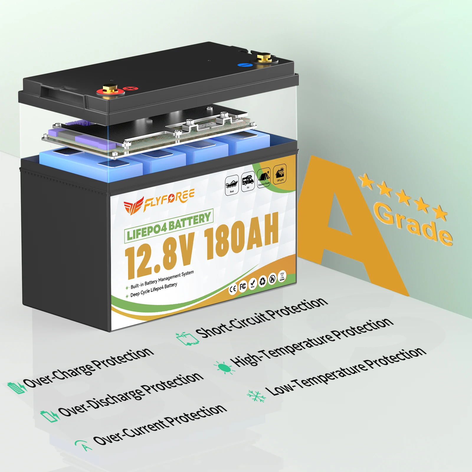 【RV battery】 An Affordable 12V 180Ah Plus Deep CycleLiFePO4 lithium battery with a 5-year warranty and 4000+ cycles @100% DOD. Your optimal & adequate Battery for RVs, Camper Van, solar system, off-grid, etc.