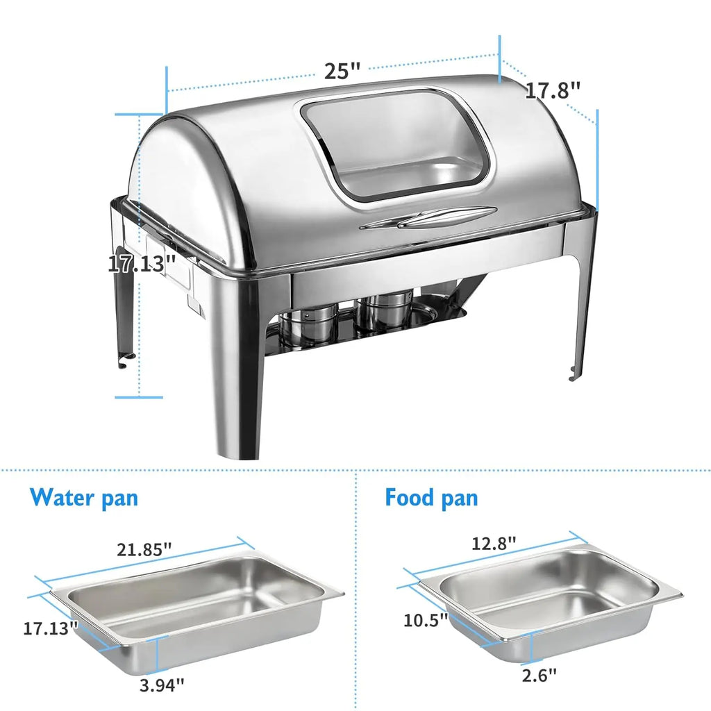 Premium Stainless Steel Material: The Roll Top Chafing Dish Buffet Set Is Made Entirely Of High-Quality Stainless Steel, Which Not Only S Durability But Also Makes It Easy To Clean. The Stainless Steel Construction Is Ideal For Food Warmers For Parties, As It Is Resistant To Rust, Corrosion, And Staining, Ensuring A Long-Lasting And Hygienic Product.
