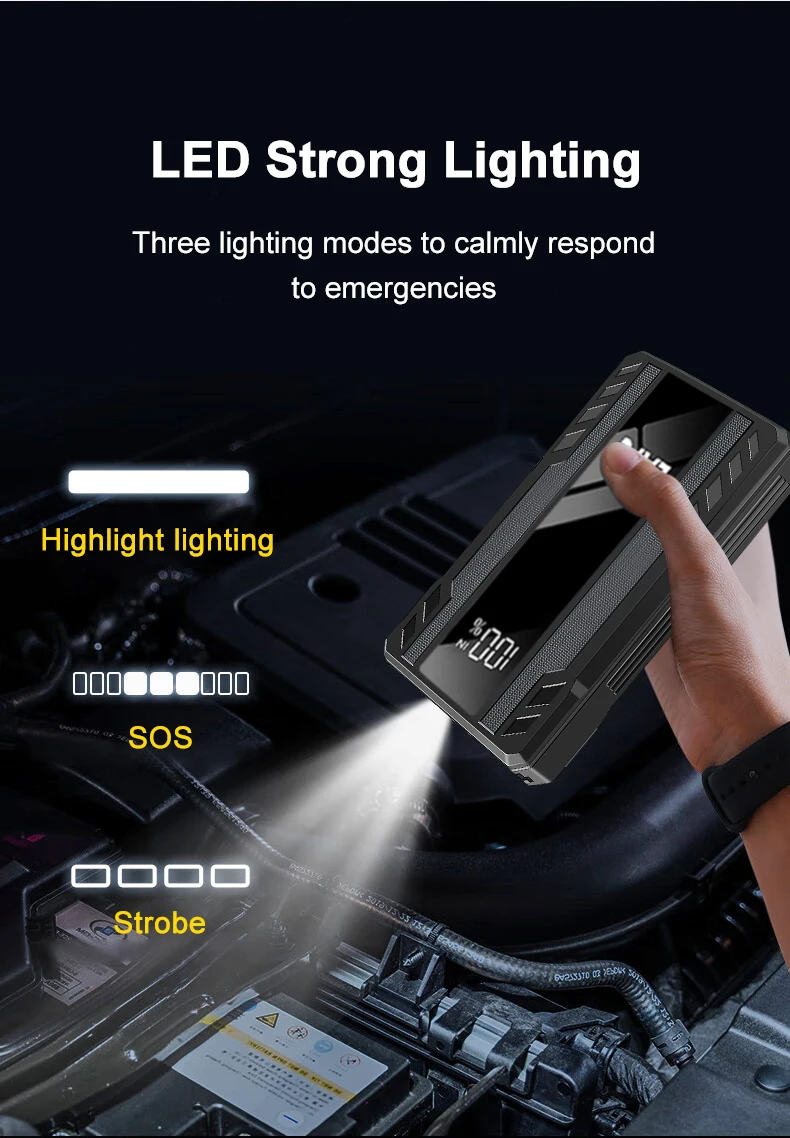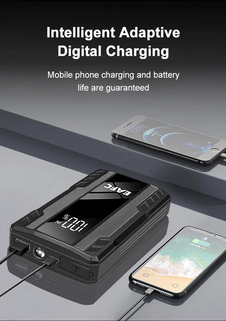 Never get stuck with a dead battery! This compact powerbank jump-starts your car, charges your devices, and lights up the dark. Professional-grade performance packed in your pocket.