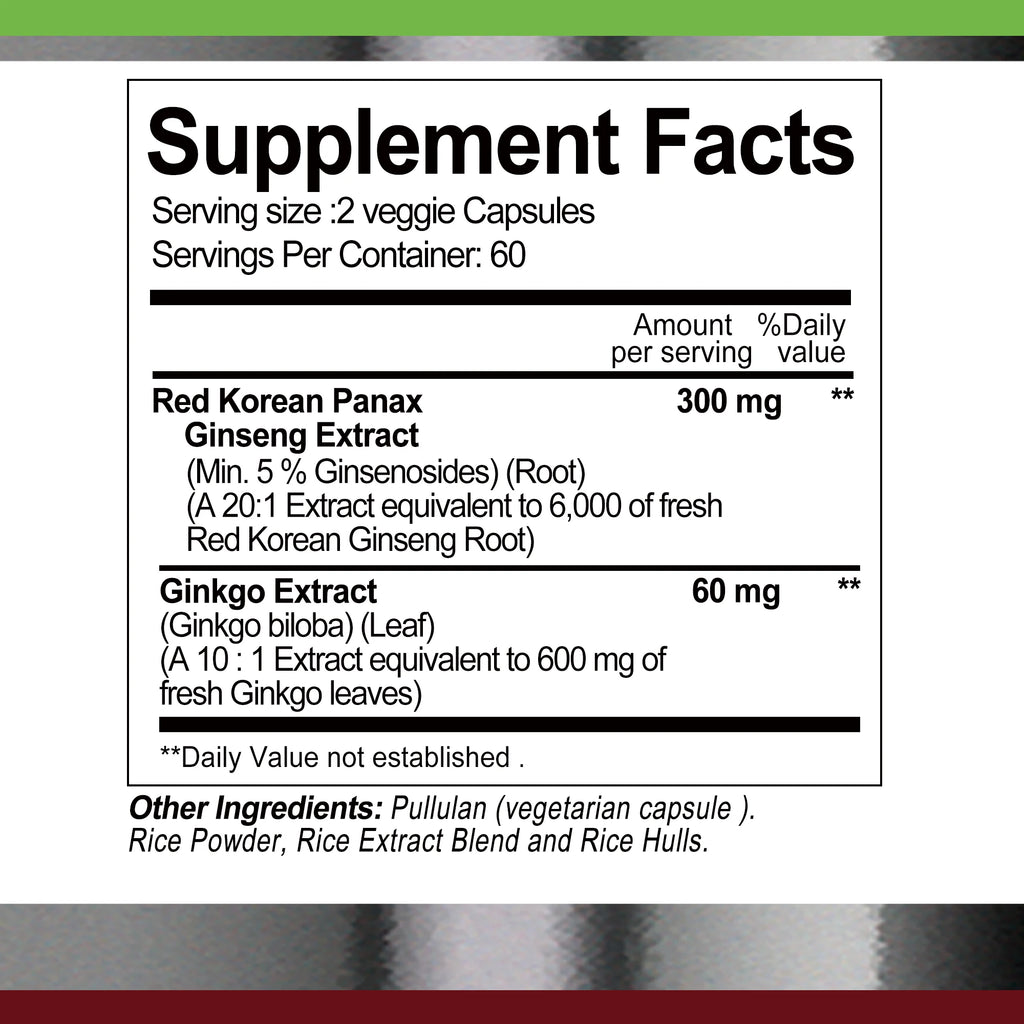 2-IN-1 POWERFUL FORMULA - Korean red ginseng is rich in %5 ginsenosides to support increased energy, focus and productivity. Organic Ginkgo Leaf Extract is known for supporting healthy brain function, helping to improve cognitive function, memory and concentration.