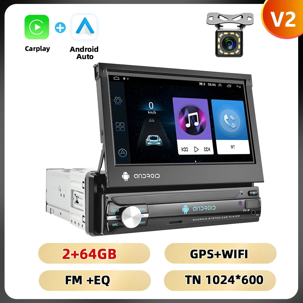 Podofo 1Din 7 ''Car Multimedia Player 8 + 128G 8Core Car Radio Carplay Android Car WIFI GPS Navigation Retractable Screen Stereo