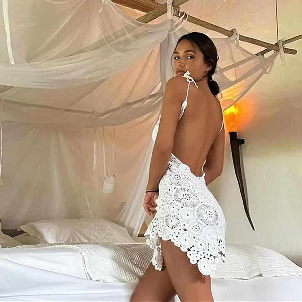 2025 Summer Hollow Out Lace Mini Dress Women Sexy V-neck Spaghetti Straps Backless Vacation Beach Outfits Bikini Cover Ups