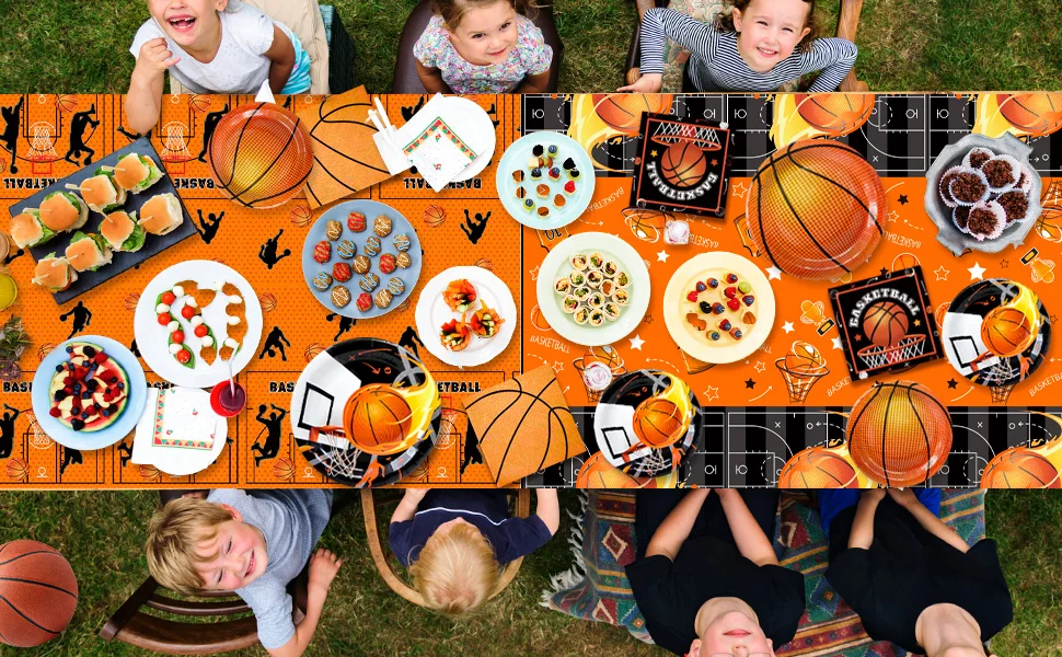 This basketball birthday tableware set includes 1 basketball birthday banner, 2 basketball tablecloth, 20 7'' basketball birthday plates, 20 9'' basketball paper plates, 20 basketball napkins etc basketball themed tableware.