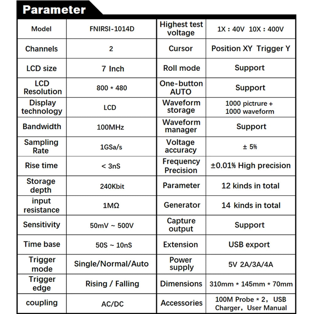 FNIRSI-1014D is a two in one oscilloscope and signal generator, the real-time sampling rate is 1GSa / s and with 100MHz* 2 ana-log bandwidth, with 7inch TFT LCD display screen, the built-in high-voltage pro-tection module can tolerate up to 400V continuous voltage, without worrying about the oscilloscope burning accident caused by the probe not moving to 10x gear, built in DDS function signal generator and the industry's ori-ginal chopping output (@ 2.5vpp), all signal frequency step is 1Hz, support 14 kinds of standard function signal and a customizable chopping signal, chopping The output device intercepts part or the whole part of the complex signals measured by the oscilloscope as the output signal of the signal generator, which can store up to 1000 customized cut-off signals. Come on and try it, it will not let you down.