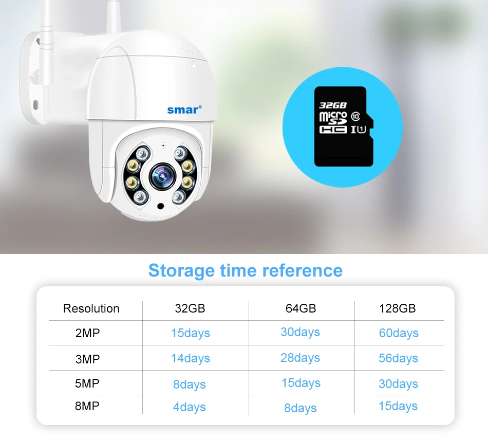 The SD card storage time reference table is a reference data. This data is a reference value in the motion detection video mode. The accurate storage time depends on your use scene and environment, which may be shorter or longer than the reference data provided by us;